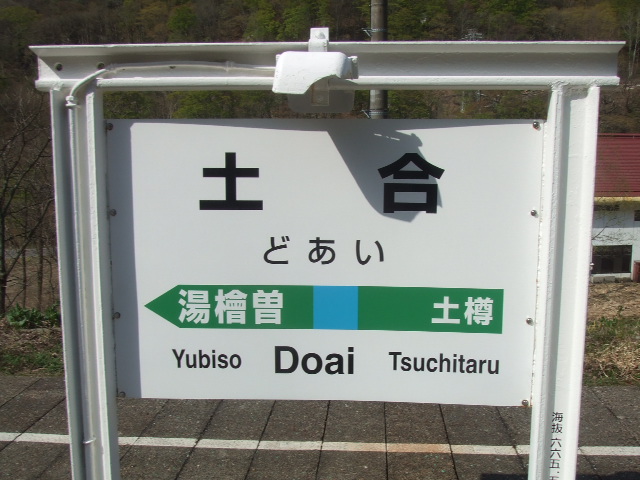 남행 열차(미나카미 방면)를 위한 지상 승강장은 지상에 있다. 상하행 홈 사이에는 81m의 고저차가 있다. 하행 홈에서 역으로 가려면, 거의 일직선으로 뻗은 462개의 계단(길이 338m)을 올라가고, 유히소 강과 국도 291호선을 가로지르는 143m의 연락 통로에 설치된 총 24개의 계단을 올라갈 필요가 있다.