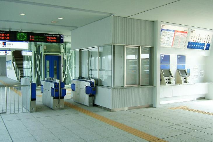 이 역은 고가 선로 아래에 역 건물이 있는 고가역이며, 섬식 승강장 1면 2선 구조를 갖추고 있다. 역 건물에는 자동 발권기와 마나카 대응 자동 개찰구가 설치되어 있으며, 역무원이 배치되어 있다. 다만, 보통은 무인역으로 운영된다.배리어 프리 시설로는 출입구와 개찰구 내부에 각각 1기씩, 총 2기의 엘리베이터가 설치되어 있다. 에스컬레이터 설치 공간은 확보되어 있지만, 아직 설치되지는 않았다. 안전 대책으로 1번과 2번 승강장에는 스크린도어가 설치되어 운영 중이다.