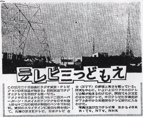 도쿄 타워 건설 전, 치요다구에서 미나토구에 걸쳐 난립했던 NHK, NTV, KRT의 철탑(1955년 1월, 미나토구 아카사카 잇츠키마치〈현재 미나토구 아카사카 5정목 부근〉에서 촬영된 것)
