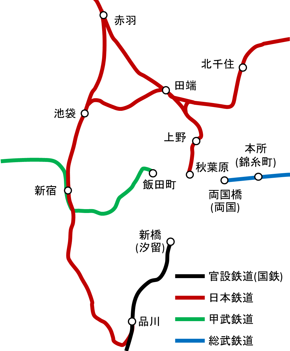 1904년 도쿄의 간선 철도망. 도쿄역 개통 10년 전이며, 이 노선들을 통합한 종착역으로 건설되었다.