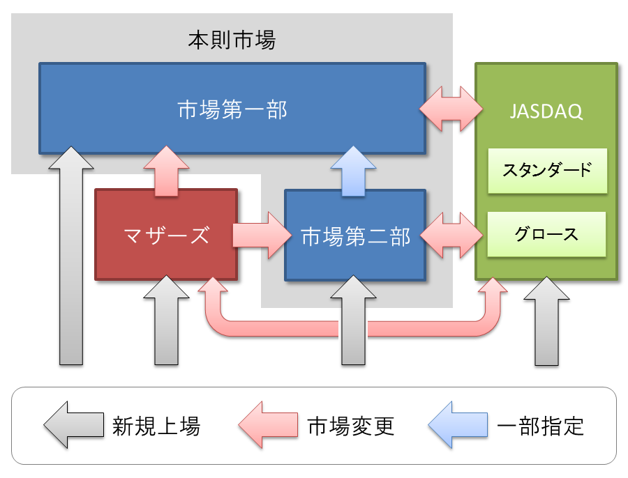 도쿄증권거래소의 주식시장에는 상장 기준이 다른 프라임, 스탠다드, 신흥기업을 위한 그로스 시장이 있다.