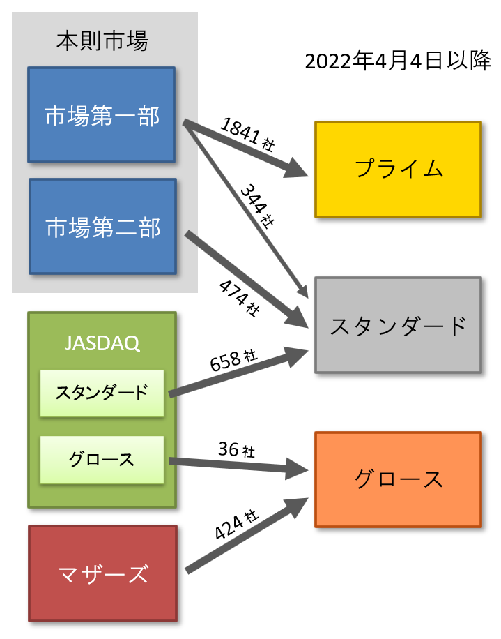 - 2022년 4월 4일 - 새로운 시장인 프라임·스탠다드·그로스로 이행.[50]