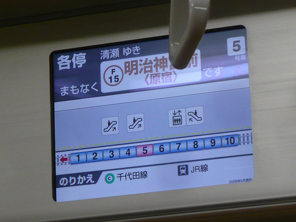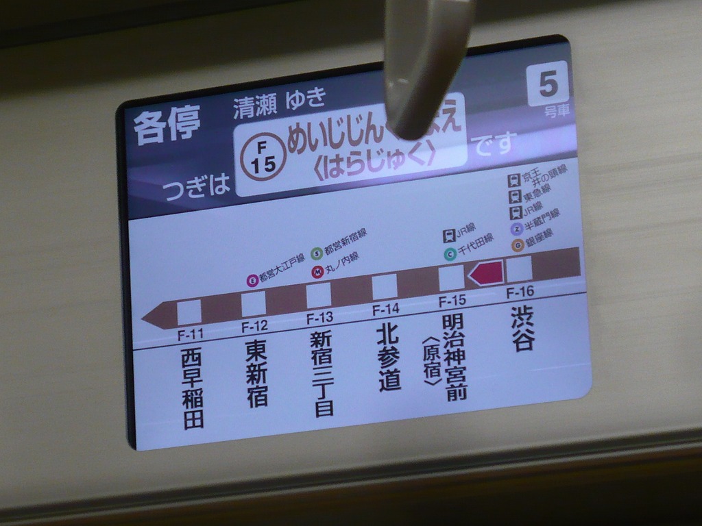 당초 각역 정차의 경우 종별 표시는 하지 않았다. 이후 후쿠토신 선 개업 전날인 2008년 6월 13일부터 각역 정차에서도 종별 표시 '각정(Local)'을 표시하게 되었다.[69] 도부 철도 도조 선 직통의 각역 정차는 와코시에서 표시가 '각정'에서 '보통'으로 전환된다(도부 철도 차량도 마찬가지). 동시에 타 회사 직통 노선에서는 스위치와 호차 표시 사이에 '유라쿠초 선 직통', '후쿠토신 선 직통', '도부 철도 도조 선 직통', '세이부 선 직통', '도쿄 급행 전철 도요코 선 직통', '시부야, 이케부쿠로 방면' 등의 문구가 표시된다.[70] 또한, 그 아래에는 직결 운행 노선 내의 종별을 알 수 있게 '지하철 선내 급행', '도조 선내 각역 정차', '세이부 선내 쾌속', '도요코 선 내 특급'(위의 직통 표시보다는 글씨가 작다) 등도 표시되고 있다.[70]