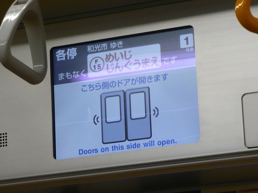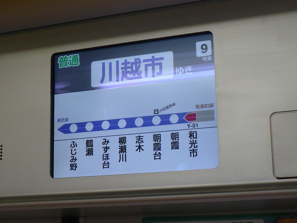 당초 각역 정차의 경우 종별 표시는 하지 않았으나, 2008년 6월 13일부터 각역 정차에서도 '각정(Local)'을 표시하게 되었다.[69] 도부 철도 도조 선 직통의 각역 정차는 와코시에서 '각정'에서 '보통'으로 전환된다. 타 회사 직통 노선에서는 스위치와 호차 표시 사이에 '유라쿠초 선 직통', '후쿠토신 선 직통', '도부 철도 도조 선 직통', '세이부 철도 이케부쿠로 선 직통', '도쿄 급행 전철 도요코 선 직통', '시부야, 이케부쿠로 방면' 등의 사인이 표시된다.[70] 그 아래에는 직결 운행 노선 내의 종별을 알 수 있게 '지하철 선내 급행', '도조 선내 각역 정차', '세이부 선내 쾌속', '도요코 선 내 특급' 등도 표시된다.