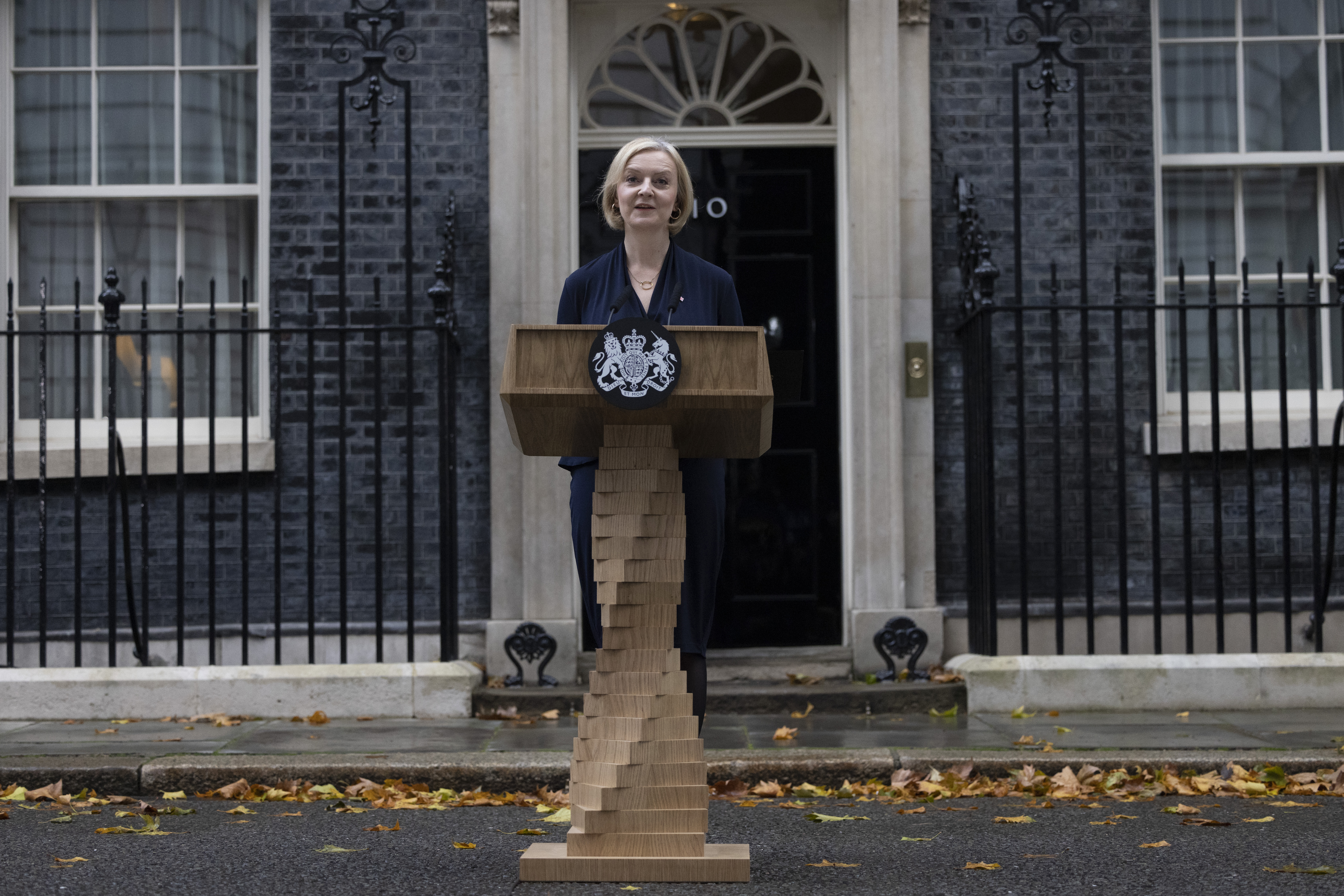 영국 총리 리즈 트러스가 2022년 사임 발표를 위해 연설대에서 연설하고 있다.