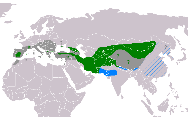 - 짙은 회색 '''?''': 불확실한 이전 번식 지역]]