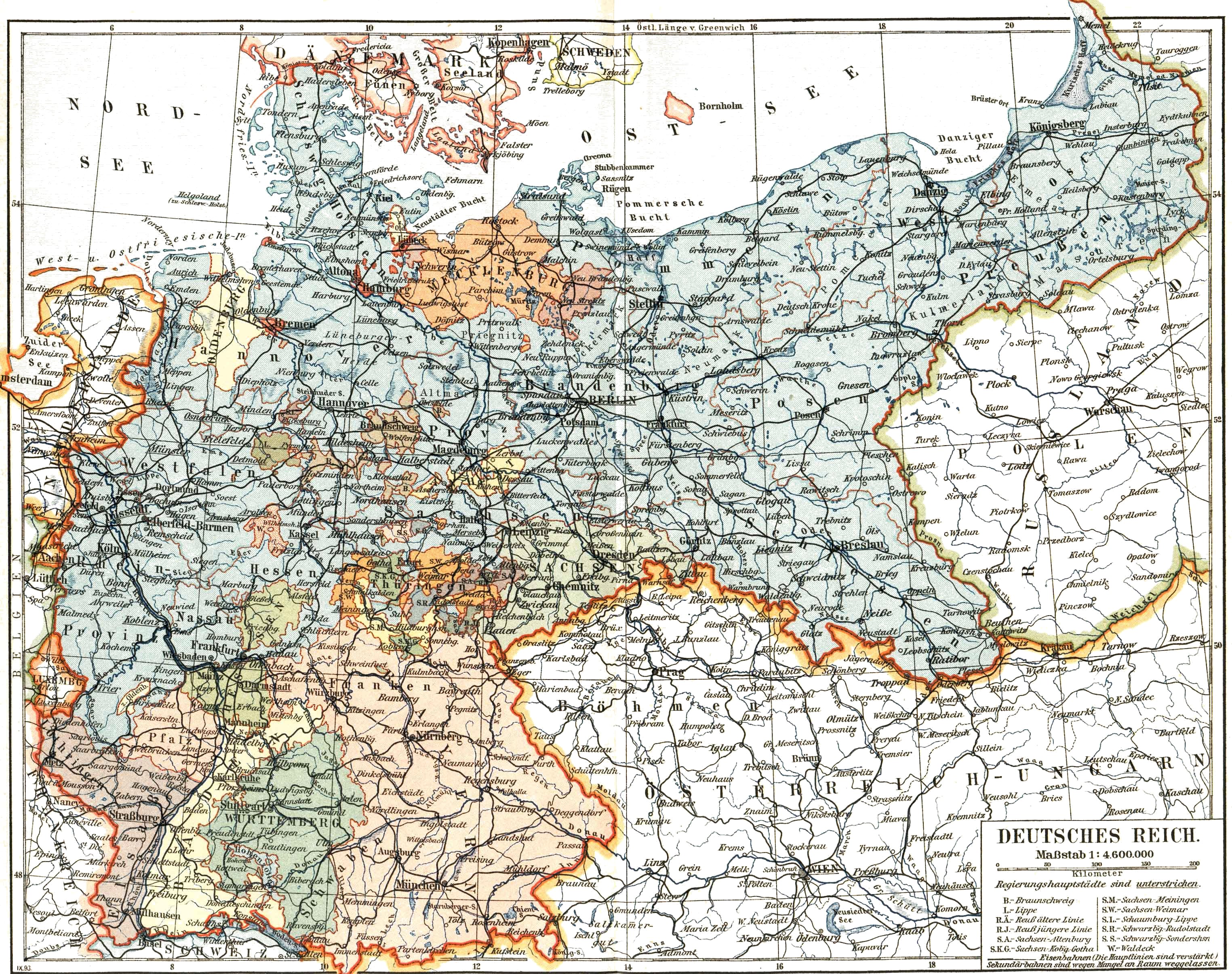 1871년 독일 통일(오스트리아 제외) 당시, 독일 제국은 각 군주국이 정의된 영토를 가지고 연방에 가입하면서 헌법적으로 군주국의 연합으로 설립되었다. 그 결과 '독일 제국'의 통일 민족주의는 처음에는 (1871년 헌법 제1조에서) 이 특정 하위 집합인 독일 군주국의 이전 경계 내의 영토로 규정되었다.[8]