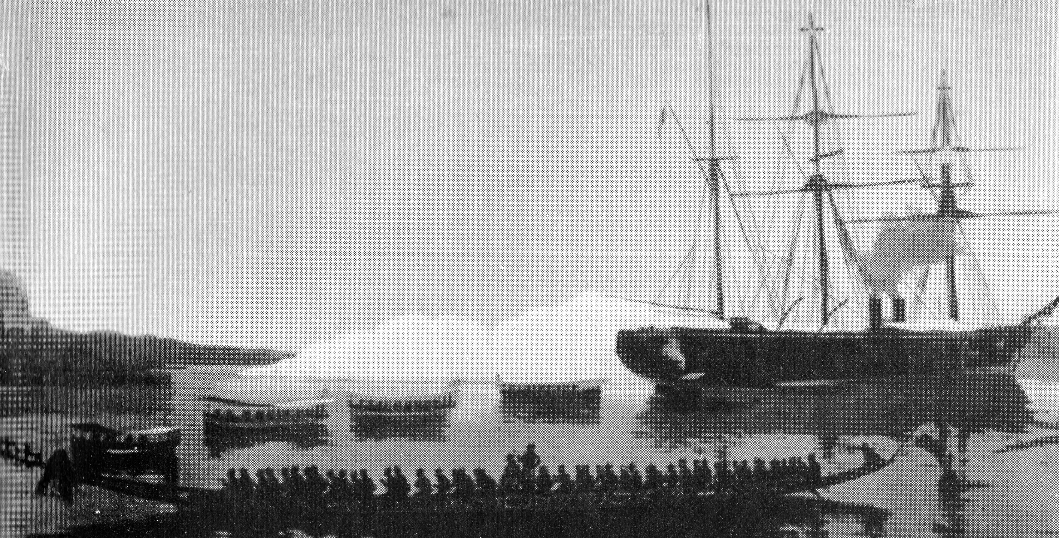 함대는 1884년 10월 30일 서아프리카를 향해 출항했다. 카보베르데 제도에 도착한 후 함대는 나뉘어, SMS 아리아드네는 라이베리아와 기니만 연안을 담당하고, SMS 그나이제나우는 동아프리카로 파견되었다. SMS 비스마르크와 SMS 올가는 1884년 12월 18일 카메룬강 하구에 도착했다.[19]