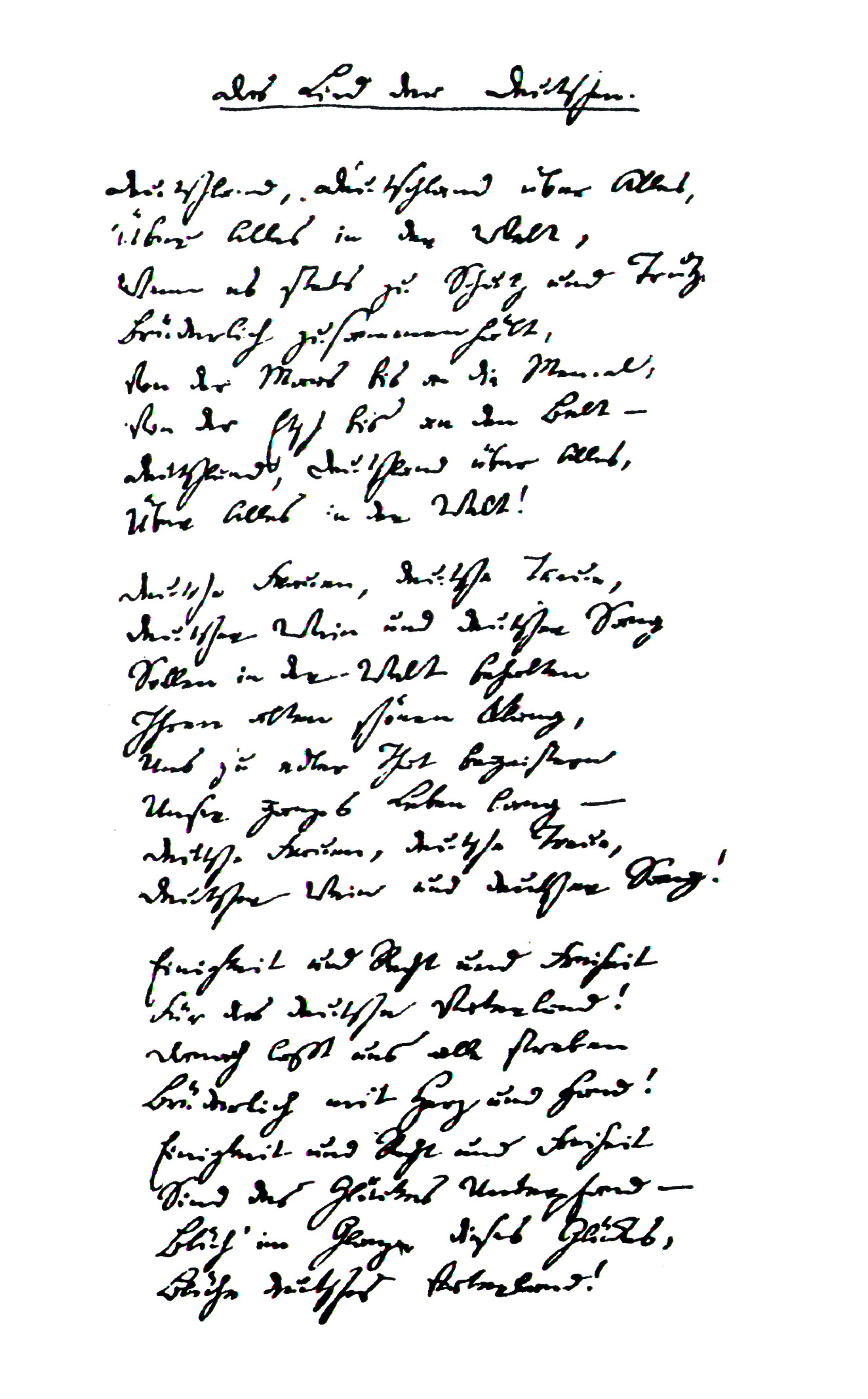 현재 독일의 공식 국가는 '독일인의 노래'(Das Lied der Deutschende)의 3절 가사이다. 이 노래의 가사는 1841년 아우구스트 하인리히 호프만 폰 팔러스레벤이 당시 영국령이었던 헬골란트 섬에서 작성했다.[4] 그는 요제프 하이든1797년 신성 로마 제국 황제 프란츠 2세를 위해 작곡한 '신이여, 황제 프란츠를 보호하소서'(Gott erhalte Franz den Kaiserde)의 멜로디에 맞춰 이 시를 썼다. 이 멜로디는 이후 오스트리아 제국과 오스트리아-헝가리 제국의 국가로도 사용되었다.