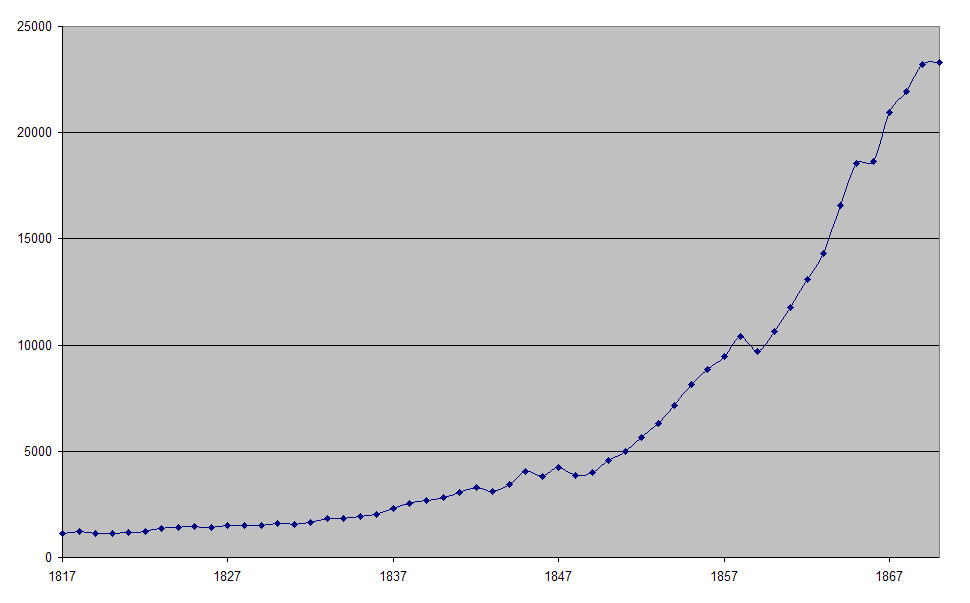하지만 1830년대부터 이주자 수는 눈에 띄게 증가하기 시작했다. 당시 만연했던 빈곤 문제와 1846년에서 1847년 사이의 농업 위기가 주요 원인이었다. 이러한 상황 속에서 이주민 수는 1847년에 8만 명에 달하며 첫 번째 정점을 기록했다.
