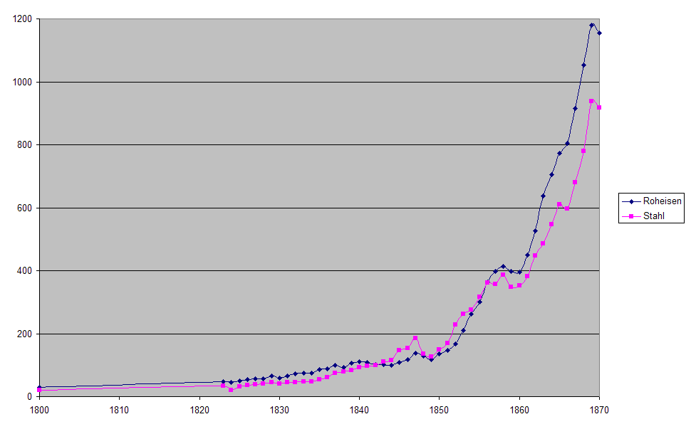 압연기를 도입한 공장과 기관차 및 기타 기계 제조소의 생산 증가는 선철 생산을 급속히 촉진시켰다. 이 시기 철강 소비량은 1834년 12만 1,039톤에서 1847년 41만 4,094톤으로 거의 3배 증가했다. 초기에는 수입품에 의존했지만 점차 자국 생산 비중이 높아졌다. 1842년 독일에 있던 245대의 기관차 중 독일제는 38대에 불과했으나, 1851년에는 1,084대 중 679대가 독일제였으며, 철로에 대한 수요도 점점 자국 제품으로 충당되었다. 철도에 대한 고정 자본 투자가 관련 금속공업의 발전을 이끌었다는 점은 독일 경제사에서 결정적인 의미를 지닌다.1851년부터 1857년까지 철 소비량은 2.5배, 선철 생산 성장 속도는 약 2.5배 증가했다. 석탄 생산 역시 2.5배 증대했으며, 면사 생산은 1850년과 1857년 사이에 100% 이상 증가했다.