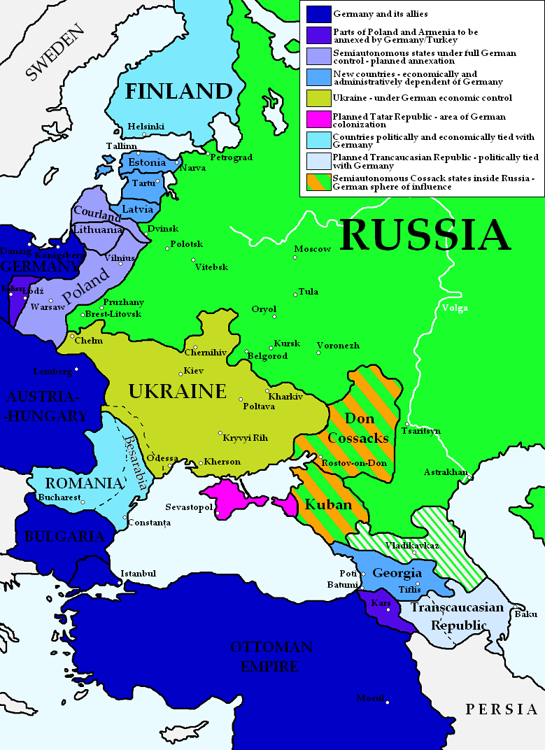 - 서부 러시아 제국에서 분할된 영토에 완충 국가 설립. 예를 들어 폴란드 및 발트 국가에 독일의 주권을 유지.