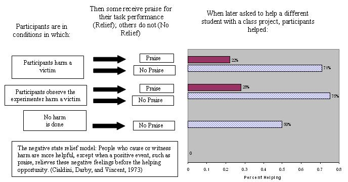 한 연구에서는 실험 참가자들에게 학생의 논문 데이터를 실수로 망치게 하거나 데이터가 망쳐지는 것을 보게 하여 죄책감을 느끼도록 유도했다. 이후 일부 참가자들에게는 칭찬과 같은 긍정적인 경험을 제공했다. 그 결과, 죄책감이라는 부정적 감정을 경험한 참가자들은 중립적인 감정을 가진 참가자들보다 돕는 행동에 더 적극적인 동기를 보였다. 하지만 칭찬을 받아 부정적인 기분이 해소된 참가자들은 더 이상 돕는 행동에 대한 높은 동기를 보이지 않았다.[12]