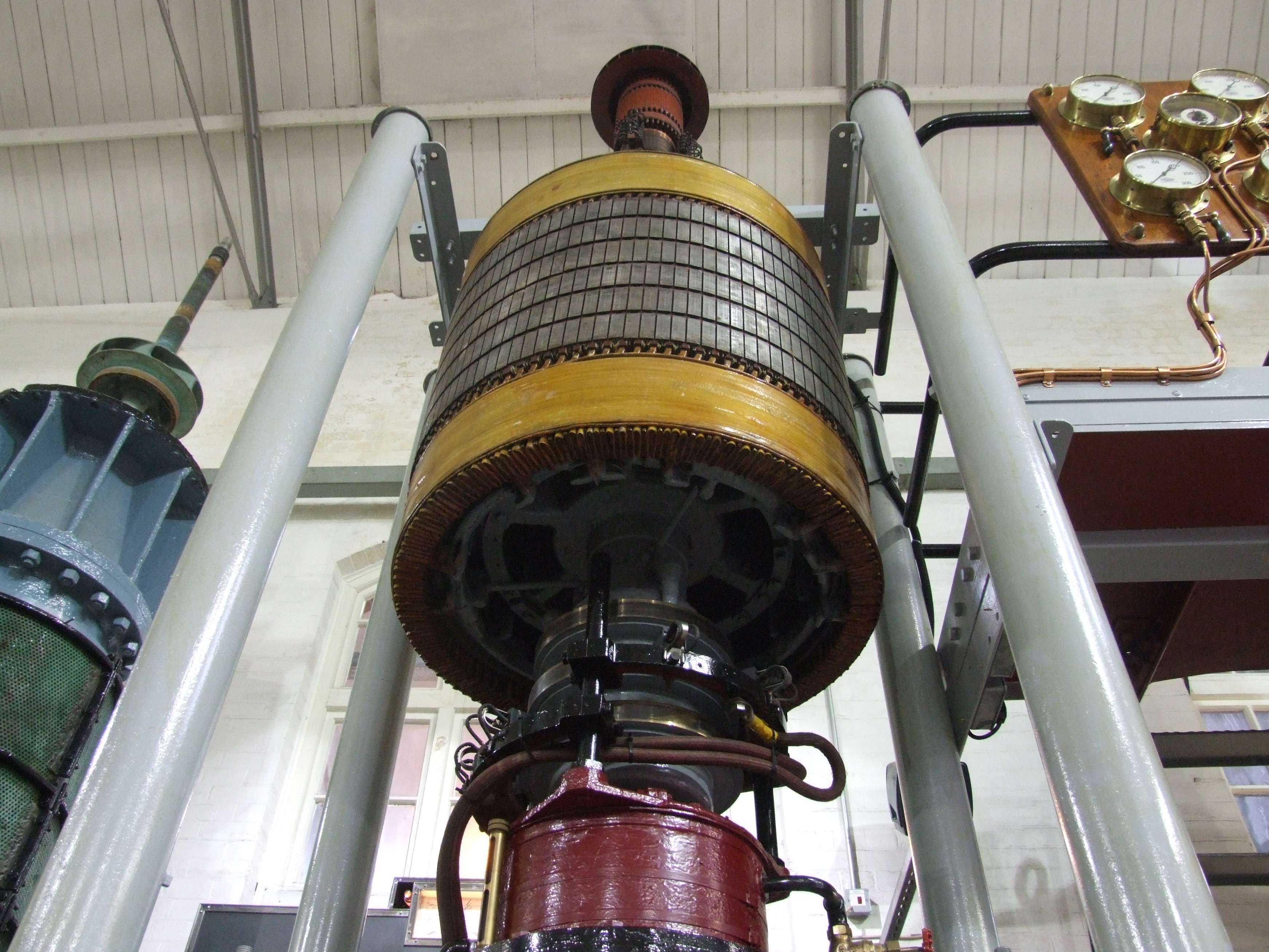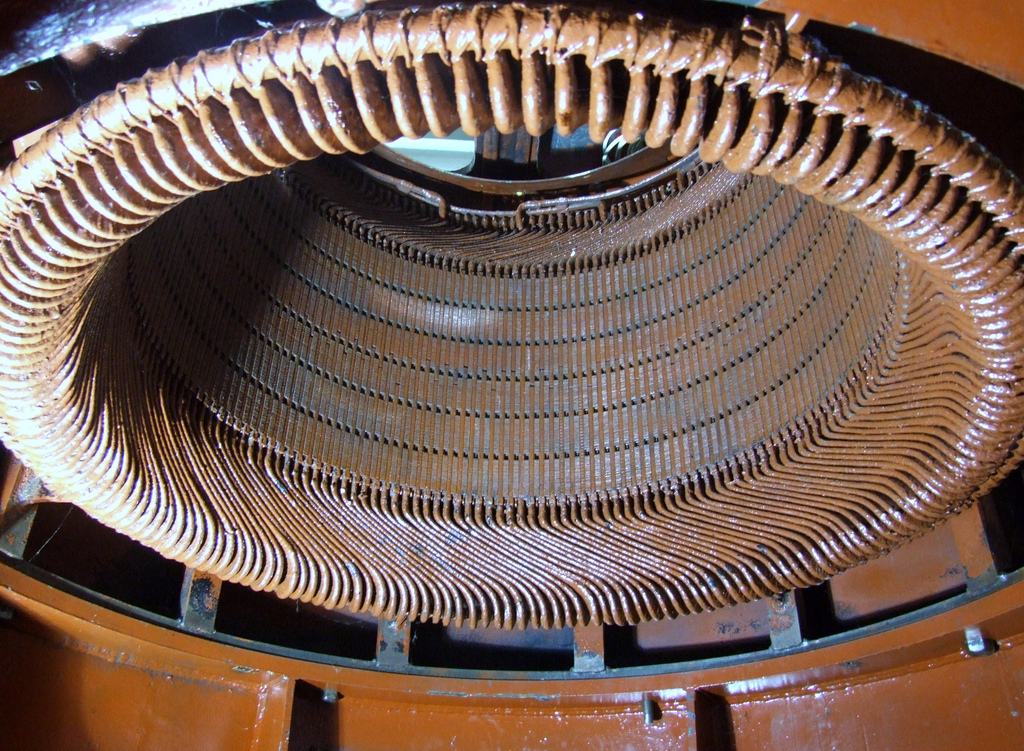고정자 프레임에는 래퍼 플레이트가 포함되어 있으며(단, 권선형 동기 이중 여자 전동기 제외), 래퍼 플레이트에는 원주 리브와 키바가 부착되어 있다. 기계의 무게를 지탱하기 위해 프레임 마운트와 기초가 필요하다.[24] 동기 고정자 권선은 3상 권선으로 구성된다. 3상 전원이 공급되며, 회전자에는 직류 전원이 공급된다.
