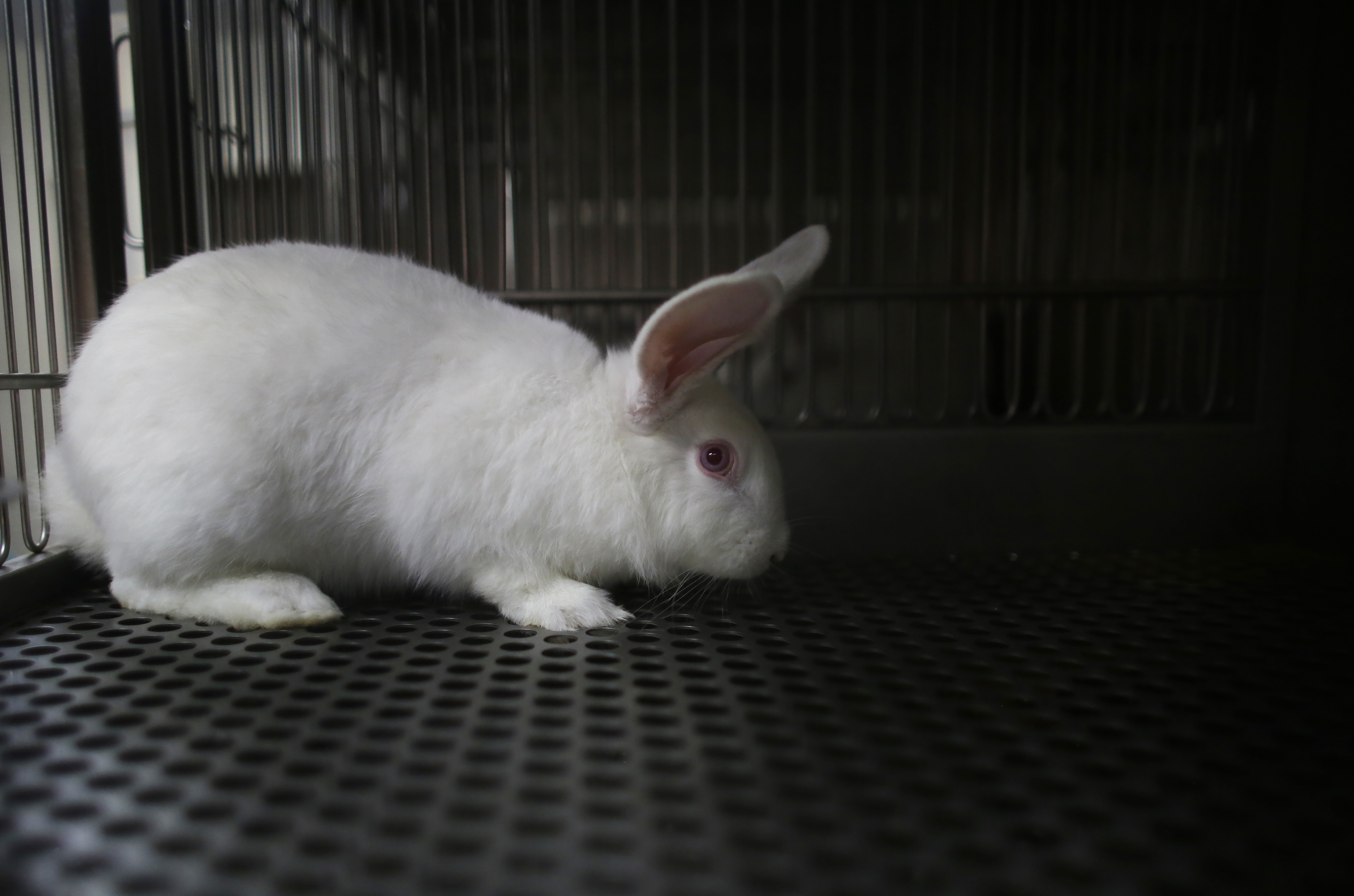 연구실 우리에 갇힌 토끼. 실험 동물의 사육 환경과 복지는 윤리적 논쟁의 대상이다.