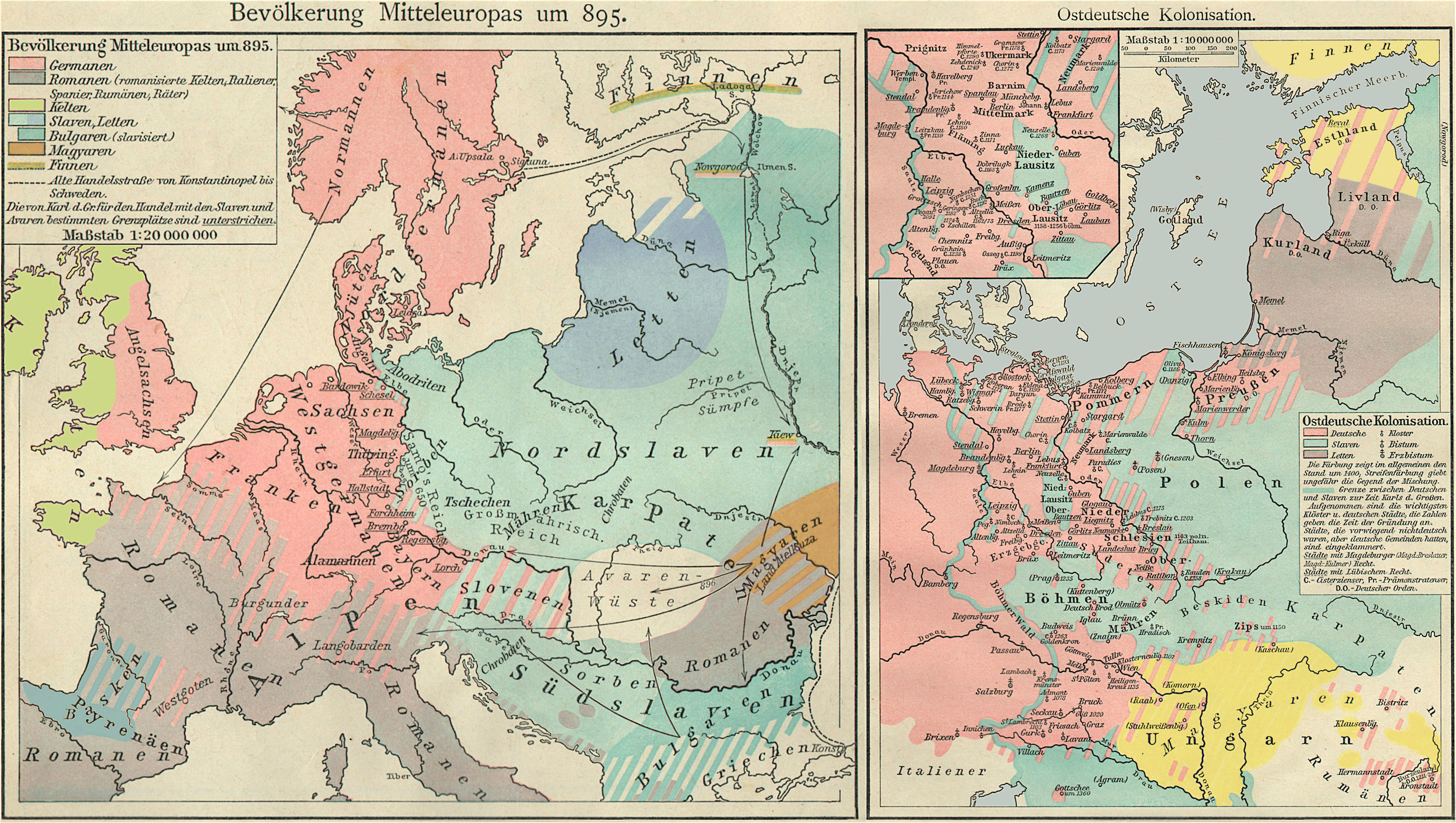 민족 이동 이후 게르만족의 정주 지역 동쪽 경계는 대략 엘베강과 그 지류인 잘레강, 보헤미아의 숲과 바이에른 경계를 잇는 선이었으며, 그 이동은 슬라브족의 거주지였다. 10세기 이후, 이 지역의 기독교 교회가 정력적으로 활동을 펼쳐 다수의 주교좌가 건설되었다.[83]