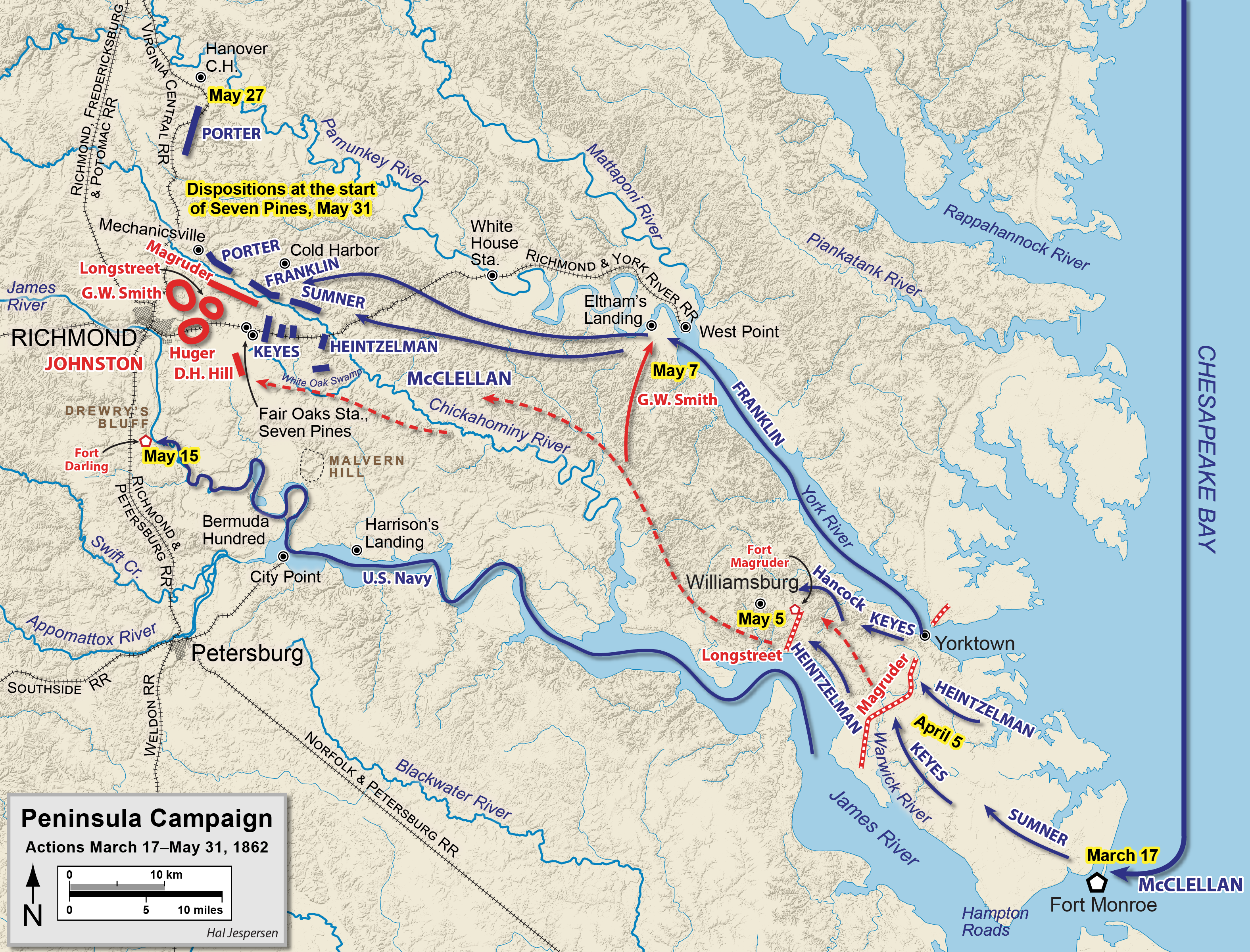 5월 말까지 연방군은 리치먼드에서 몇 마일 떨어진 곳까지 진격했지만, 진전은 더뎠다. 매클레런은 대규모 포위 작전을 계획하고 엄청난 양의 장비와 포위 박격포를 가져왔지만, 악천후와 열악한 도로로 인해 진격이 멈췄다. 매클레런은 본래 신중한 장군으로, 자신의 군대보다 두 배나 많다고 믿는 군대를 공격하는 것에 대해 불안해했다. 그러나 실제 병력 비율은 그 반대였다. 존스턴이 반도를 따라 천천히 후퇴하는 동안 그의 군대는 기만 작전을 펼쳤다. 특히, 전쟁 전 아마추어 배우였던 존 B. 매그루더 휘하의 사단은 여러 번 같은 위치를 지나 소수의 병력을 과시하며 더 큰 군대처럼 보이게 하여 매클레런을 속였다.[21]