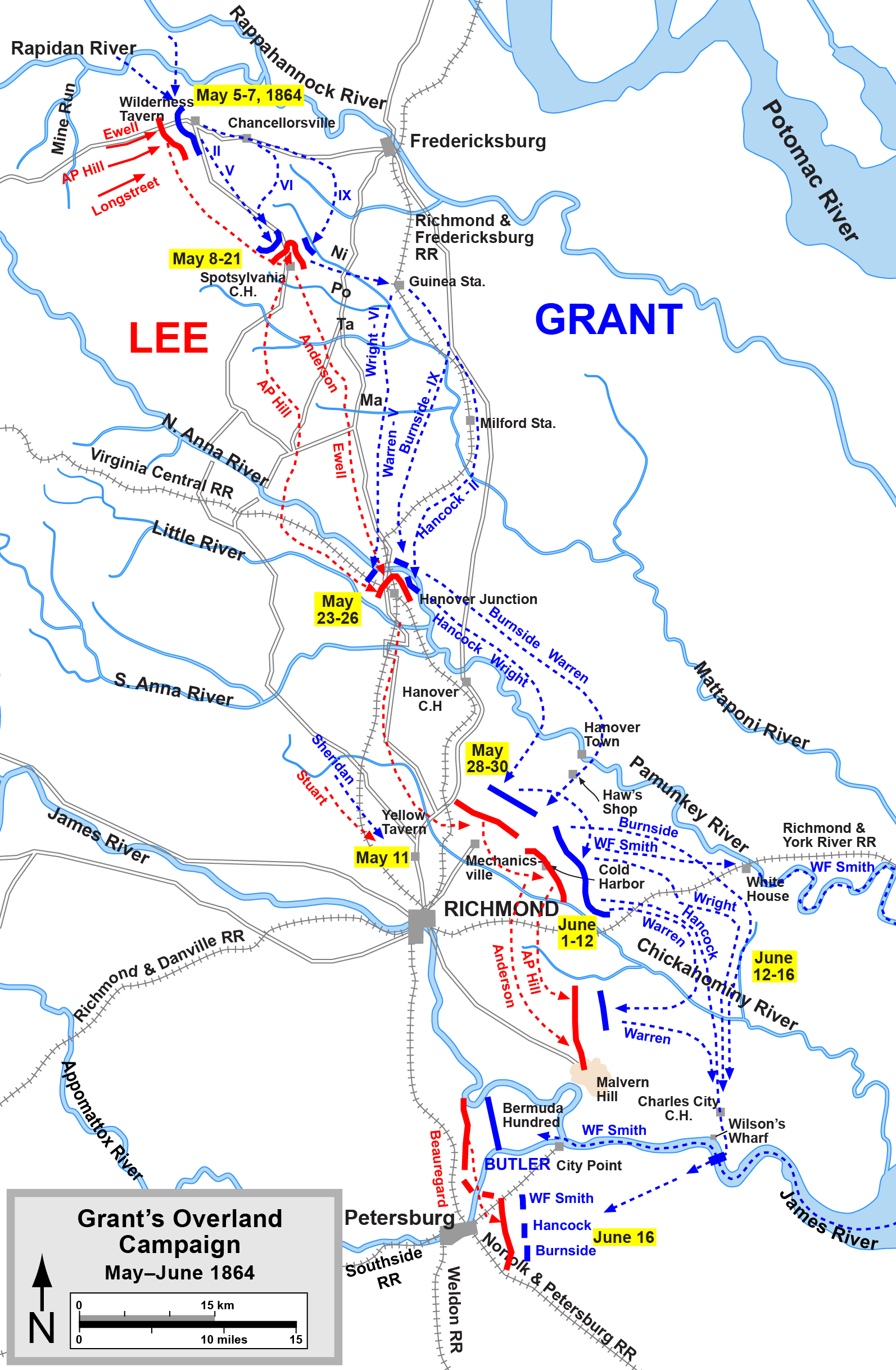 1864년, 율리시스 S. 그랜트는 중장으로 승진하여 북군 전체의 지휘를 맡게 되었다. 그랜트는 다방면에서 남군에 압력을 가하는 협동 전략을 고안했는데, 이는 개전 초부터 링컨 대통령이 장군들에게 요구했던 것과 유사했다. 그랜트는 서부 전선의 전군 지휘를 윌리엄 테쿰세 셔먼 소장에게 맡기고, 자신은 동부로 이동하여 작전 본부를 버지니아의 포토맥 군(지휘관은 미드로 유지)에 두고, 거기서 군대를 움직여 리 군과의 결전에 임할 생각이었다. 그랜트의 목표 중 두 번째는 리치먼드를 점령하는 것이었지만, 리 군을 격파하면 리치먼드는 자동으로 손에 들어올 것이라고 생각했다. 그 협동 전략은, 그랜트와 미드가 북쪽에서 리 군을 공격하고, 벤자민 버틀러는 남동쪽에서 리치먼드에 접근하며, 프란츠 시겔은 셰넌도어 계곡을 지배하고, 셔먼은 조지아주에 침공하여 존스턴 군을 격파하고 애틀랜타를 점령하고, 조지 크룩과 윌리엄 애버렐은 웨스트버지니아주의 철도 보급선에 대해 작전을 전개하고, 나새니얼 뱅크스는 앨라배마주 모빌을 점령한다는 것이었다.[56]