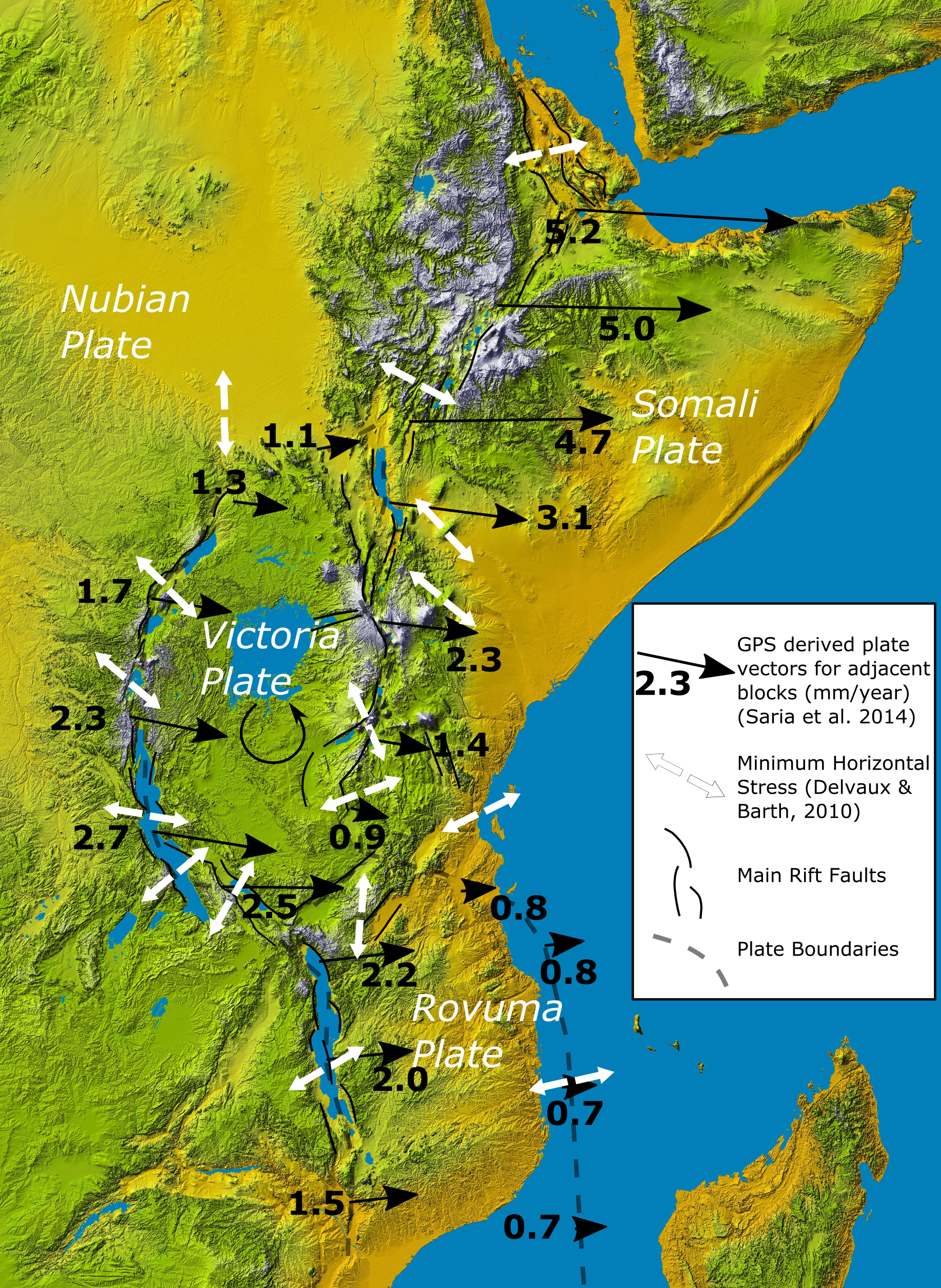 동아프리카 지구대는 아프리카 대륙을 열개(裂開)시키는 열곡대로, 아파르 삼각지대에서 시작하여 남서쪽으로 모잠비크 인근까지 이어진다. 이 열곡대는 신생대 제3기 초 올리고세(30∼35 Ma)부터 북쪽에서부터 형성되기 시작하여 현재까지 대륙 내부에서 확장 운동이 일어나고 있다.[46] 홍해와 아덴만에서는 확장 운동으로 새로운 해양지각이 생성되고 있으며,[46] 지진 활동 또한 활발하다.[47]동아프리카 지구대에는 빅토리아(Victoria), 로부마(Rovuma), 루완들(Lwandle) 등의 미판(microplates)이 존재한다.[71] 빅토리아 미판은 동부와 서부 열곡대 사이에 위치하며,[72] 소말리아판과 로부마 미판은 시계방향으로, 빅토리아 미판은 반시계방향으로 회전하고 있다.[73]
