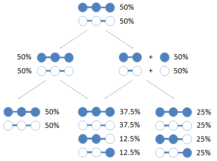 예를 들어, 그림과 같이 3개의 탄소 원자를 가진 대사물질이 있다고 가정하자. 이 물질이 반응을 통해 2개 탄소 물질과 1개 탄소 물질로 분해되었다가 다시 결합하는 경로(오른쪽 경로)와, 분해되지 않고 그대로 유지되는 경로(왼쪽 경로)가 가능하다고 하자. 만약 처음 공급된 대사물질이 50%는 완전히 13C로 표지되고(균일 표지, 파란색 원) 50%는 표지되지 않았다면(흰색 원), 반응 후 생성물의 표지 패턴은 두 경로를 통과하는 물질의 비율에 따라 달라진다. 왼쪽 경로만 따른다면 초기 비율(50:50)이 유지되지만, 오른쪽 경로를 따르면 다양한 표지 패턴(동위체, isotopomer)이 나타난다. 실제 생성물의 동위체 분포를 측정하면, 각 경로를 통해 흐르는 물질의 양, 즉 대사 흐름을 정량적으로 파악할 수 있다.[9][10]