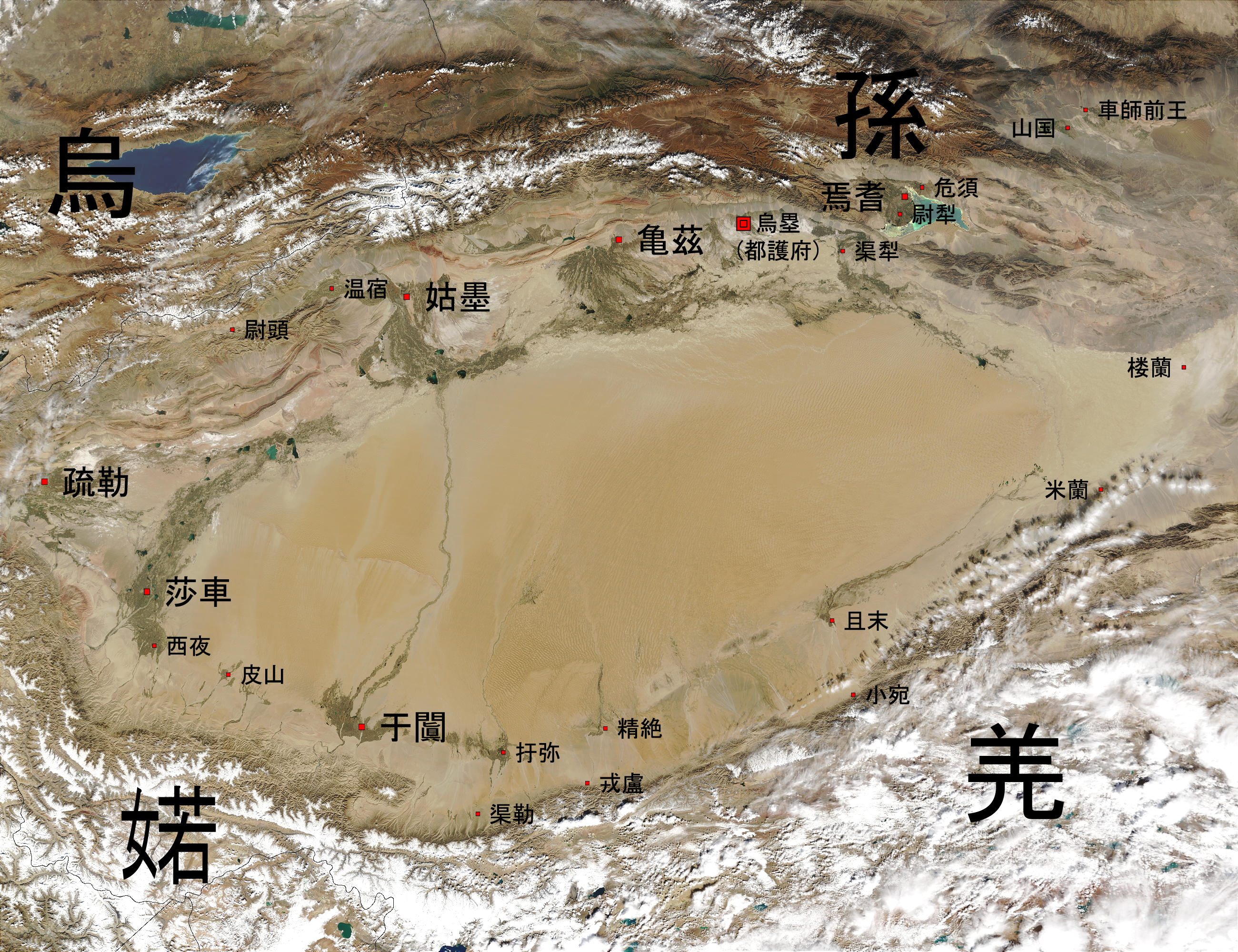 중국에서는 유문관 서쪽 지역을 서역(西域)이라 불렀다.[14][15] 기원전 2세기, 중국 저술가들은 타클라마칸 사막 남북 가장자리의 도시 국가들을 "서역의 성곽 도시 국가들"이라고 불렀다. 기원전 60년, 한나라타림 분지의 모든 오아시스 국가들을 담당하는 서역도호부를 설립하여 소규모 농업 군사 식민지를 통해 간접적으로 통치했다. 도호는 우뢰(쿠차 서쪽)에 주둔했다.[16][17] 도시 국가들은 서로 독자적인 정책을 수행할 수 있었다.