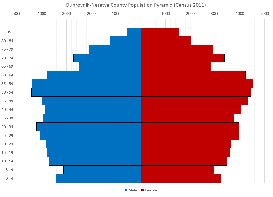두브로브니크네레트바 주의 인구는 2021년 조사 기준 115,564명이며, 인구 밀도는 1제곱킬로미터당 65명이다.[4] 2011년 조사에서는 122,568명으로 1제곱킬로미터당 69명이었다.[5]연도 인구 1857 63,379 1869 63,292 1880 69,185 1890 74,708 1900 83,135 1910 87,665 1921 86,610 1931 90,577 1948 88,535 1953 94,812 1961 99,593 1971 108,131 1981 115,683 1991 126,329 2001 122,870 2011 122,568 2021 115,564
