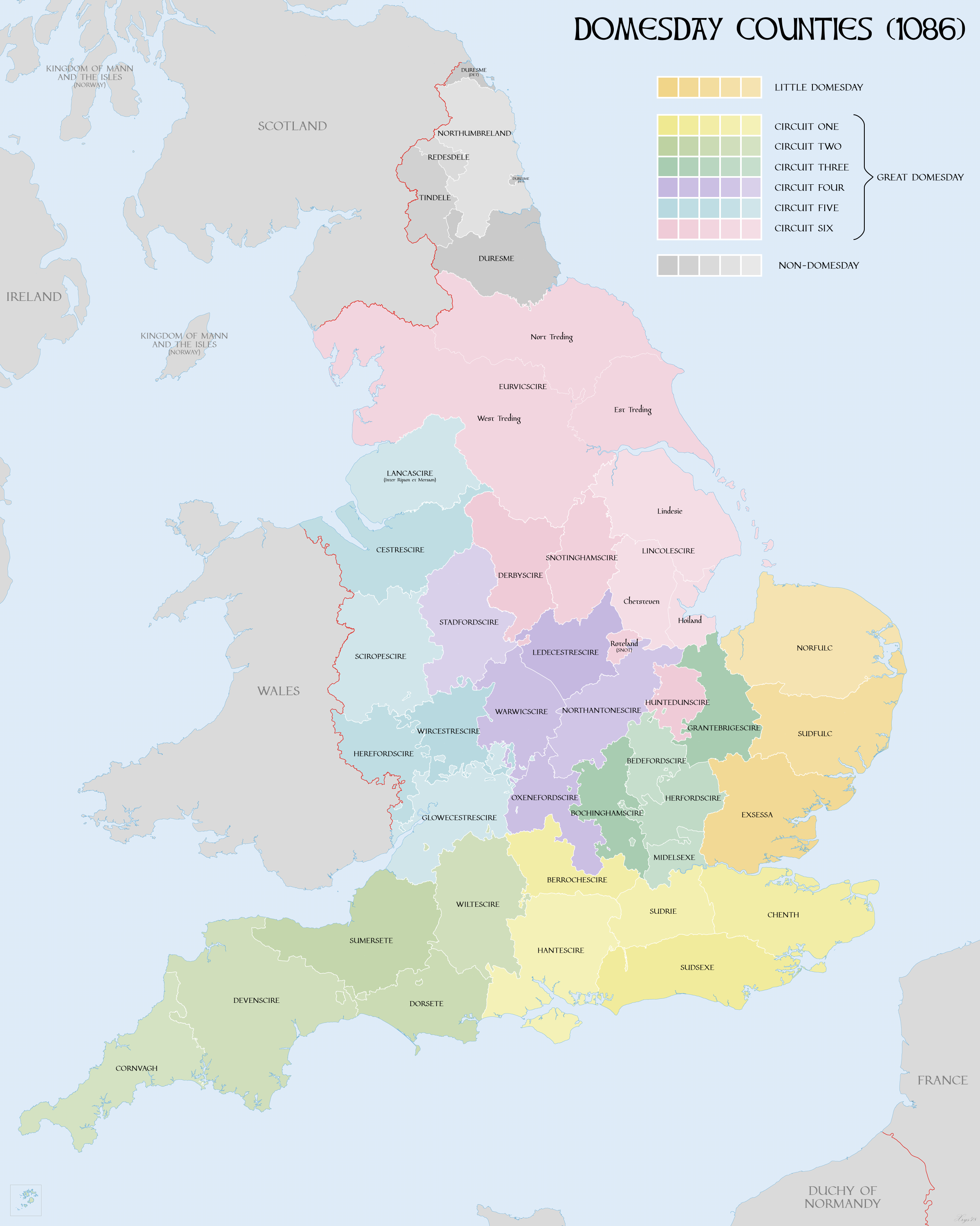 어떤 세부 정보가 어떤 카운티에 기록되어 있는지 비교하여, 6개의 그레이트 둠스데이 "순회 구역"을 결정할 수 있다(리틀 둠스데이 샤이어의 일곱 번째 순회 구역 포함).