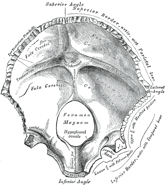 안쪽 면은 오목하며, 십자융기에 의해 네 부분으로 나뉜다.[8] 위쪽 두 부분은 삼각형으로 대뇌의 뒤통수엽이, 아래쪽 두 부분은 사각형으로 소뇌 반구가 들어간다.[9] 십자융기의 교점은 안뒤통수융기라고 한다.[8] 안뒤통수융기에서 위쪽으로 뻗는 것은 뼈의 위쪽 각을 향해 뻗는다. 한쪽(일반적으로 오른쪽)에 위시상정맥동고랑 뒤쪽에 위치한 시상고랑이 있다. 십자융기의 아래쪽은 안뒤통수능선이라고 하며, 큰구멍 근처에서 두 갈래로 나뉘어 소뇌낫에 붙는다. 양쪽 모두 안뒤통수융기에서 뼈의 측면까지 가로정맥동고랑이 뻗어 있으며, 소뇌 천막에 붙는다.