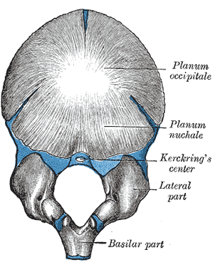 - 뒤통수 평면은 두 개의 중심에서 골화되고, 바닥 부분은 하나의 중심에서 골화된다.
