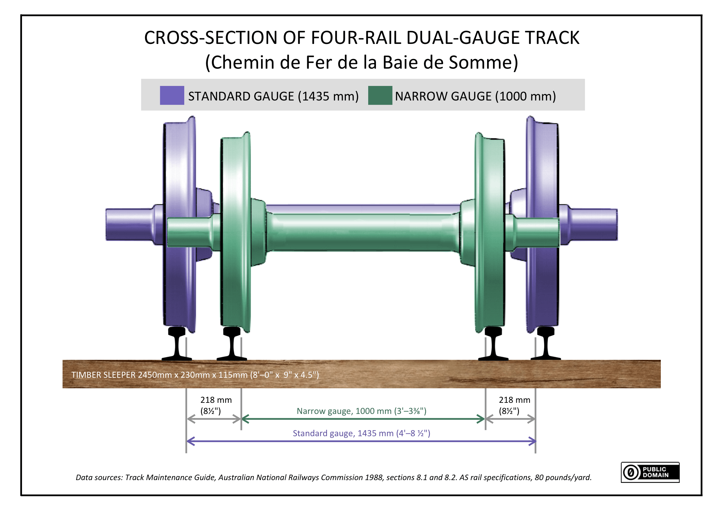 세 개의 레일로 이중 궤간 선로를 건설하는 것은 두 개의 인접한 레일을 스파이크 또는 레일 클립과 같은 레일 체결 하드웨어에 필요한 공간 이상으로 분리할 수 있을 때 가능하다. 일반적으로 40mm이다. 두 궤간이 그보다 더 가까우면 4개의 레일을 사용해야 한다. 사용되는 레일 체결 장치 및 레일의 무게(무거운 레일은 더 큼)에 따라, 두 궤간 간의 실용적인 차이는 145mm에서 200mm 범위이다.[8]colspan="2" | -- -- -- -- --