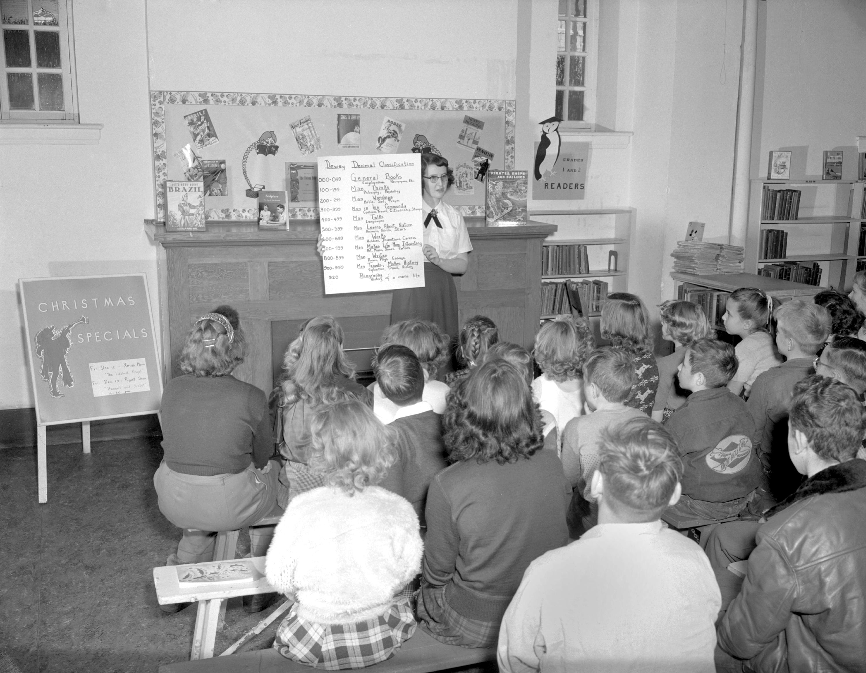 1960년대 캐나다 앨버타주 에드먼턴의 한 도서관에서 어린이들에게 듀이 십진 분류법의 최상위 범주를 가르치고 있다