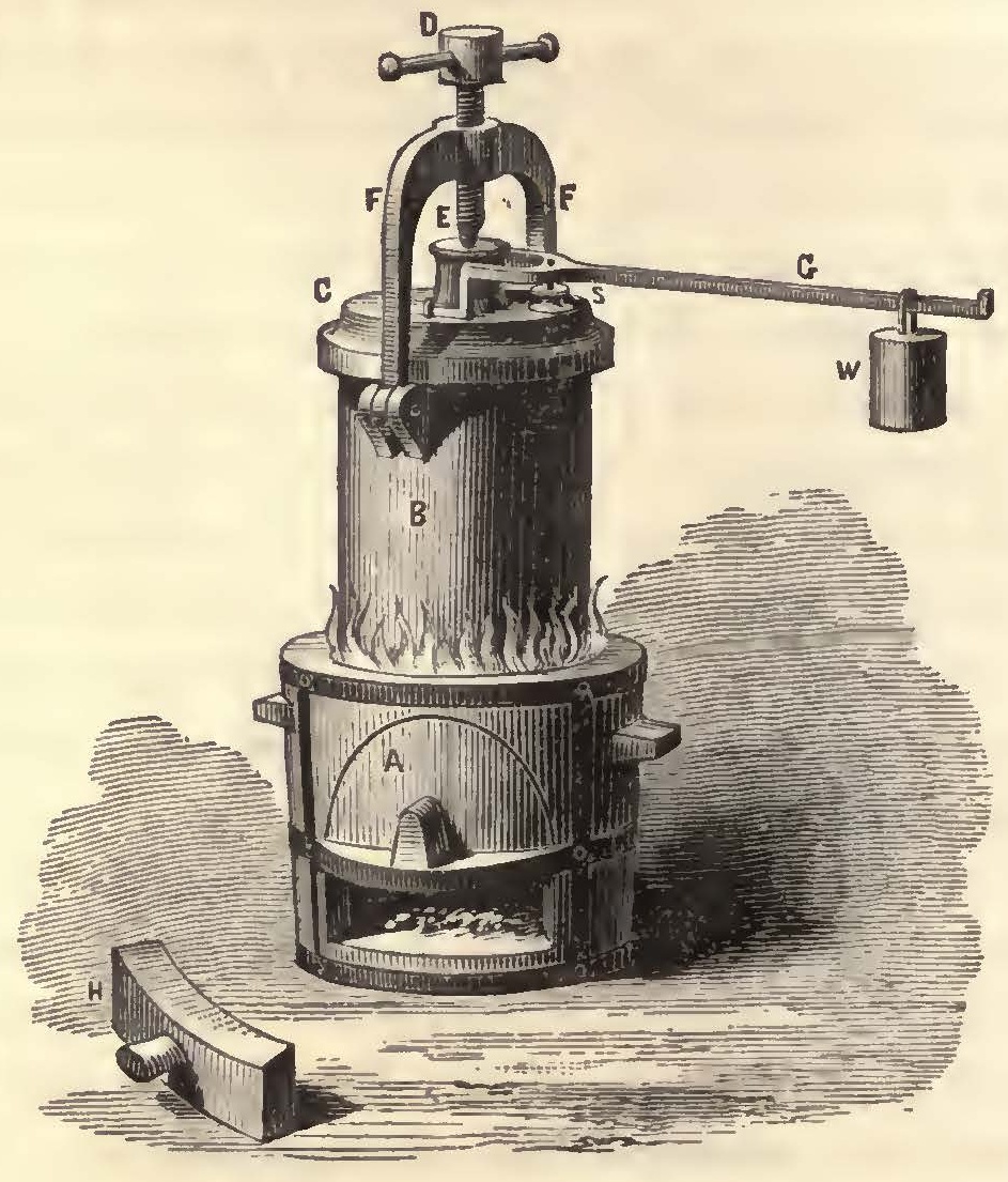 1690년 마르부르크에서 파팽은 자신의 '증기솥'에서 대기압의 기계적 힘을 관찰한 후 최초의 피스톤 증기기관 모델을 제작했다.[9] 금속 실린더 A의 바닥에 소량의 물을 넣고, 피스톤 B를 물에 닿도록 놓은 후, 피스톤 아래의 공기를 배출하고 구멍을 막았다. 실린더 아래에 불을 가하여 내부의 물을 증발시키면, 증기가 피스톤을 실린더 꼭대기까지 밀어 올렸다. 걸쇠로 피스톤을 고정하고, 불을 제거하여 실린더를 냉각하면 증기는 응축되어 실린더 내부는 진공 상태가 되었다. 이 상태에서 걸쇠를 제거하면, 피스톤은 대기압에 의해 아래로 밀려 내려왔다. 피스톤 손잡이에 연결된 로프로 도르래를 통해 무게를 들어 올릴 수 있었다.
