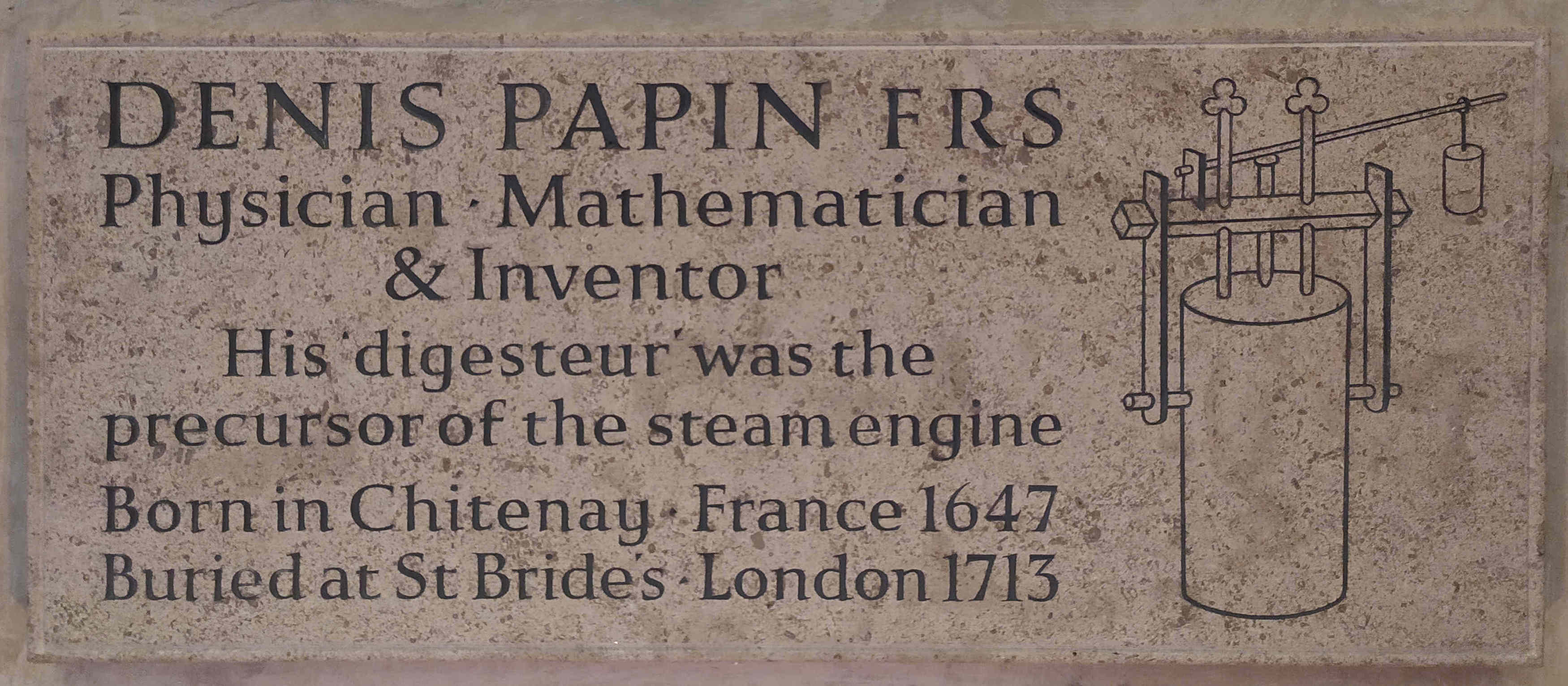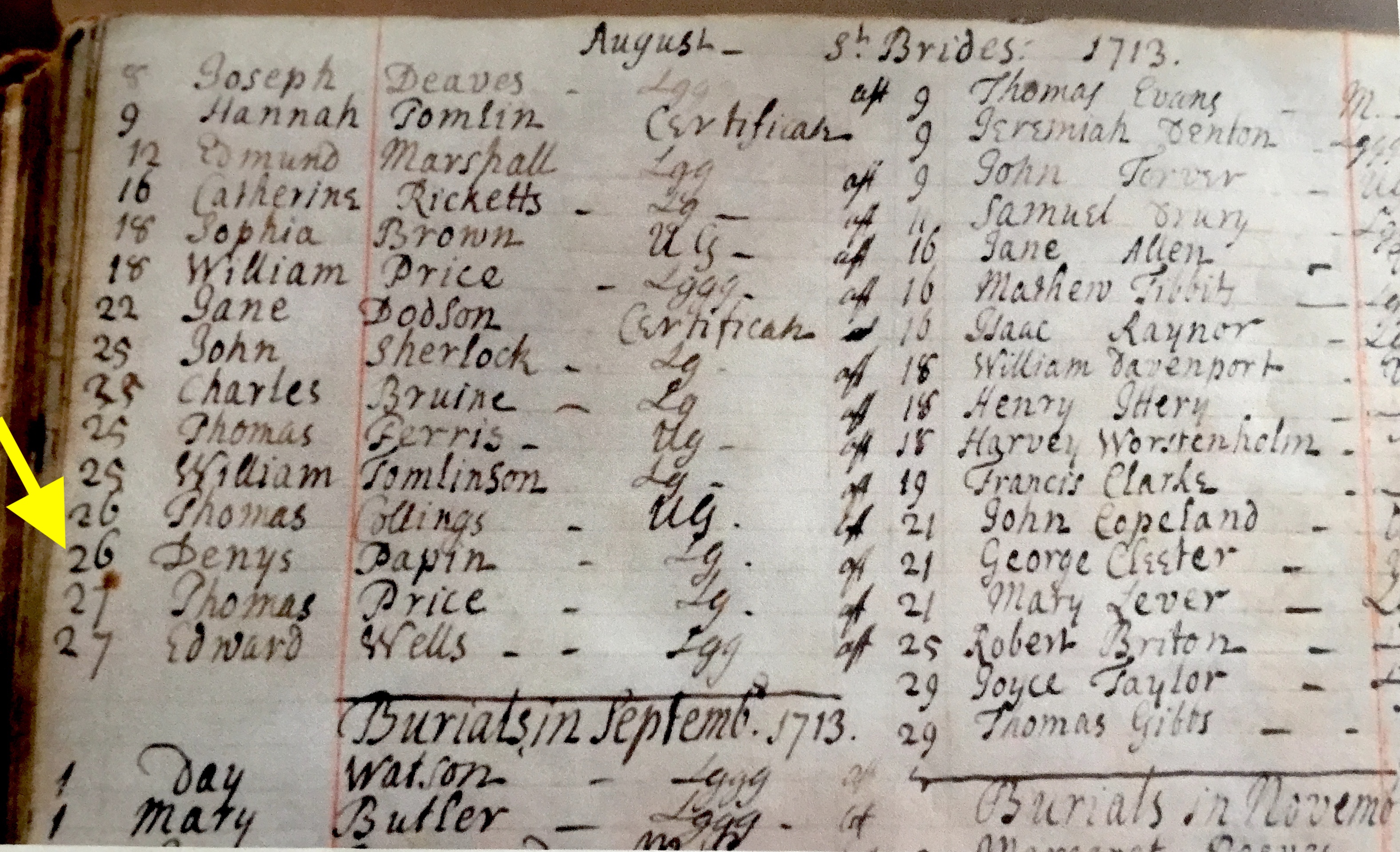 그러나 2016년에 런던 플릿 스트리트의 세인트 브라이드 교회(St Bride's Church)의 매장 기록[19]이 런던 메트로폴리탄 기록 보관소(London Metropolitan Archives)에서 발견되어, 1713년 8월 26일에 세인트 브라이드 교회의 두 매장지 중 하나인 "the Lower Ground"에 "Den'''y'''s Papin"으로 매장되었을 가능성이 밝혀졌다. 이를 바탕으로 세인트 브라이드 교회 서쪽 입구에 기념 명판이 설치되었다.