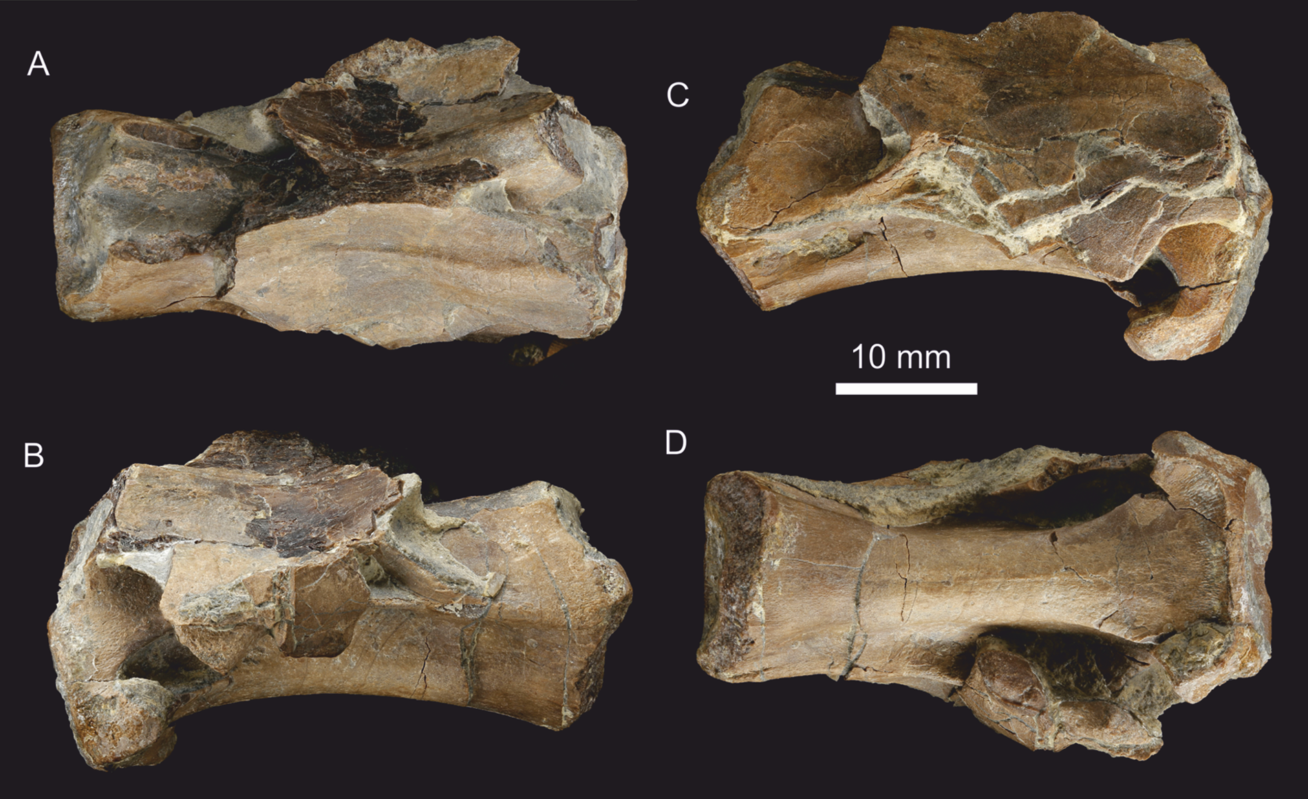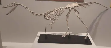 - 뒷다리 및 골반: 치골 양쪽, 왼쪽 좌골, 오른쪽 대퇴골, 경골, 비골 상단 부분, 왼쪽 거골, 족근골 3개, 중족골 3개