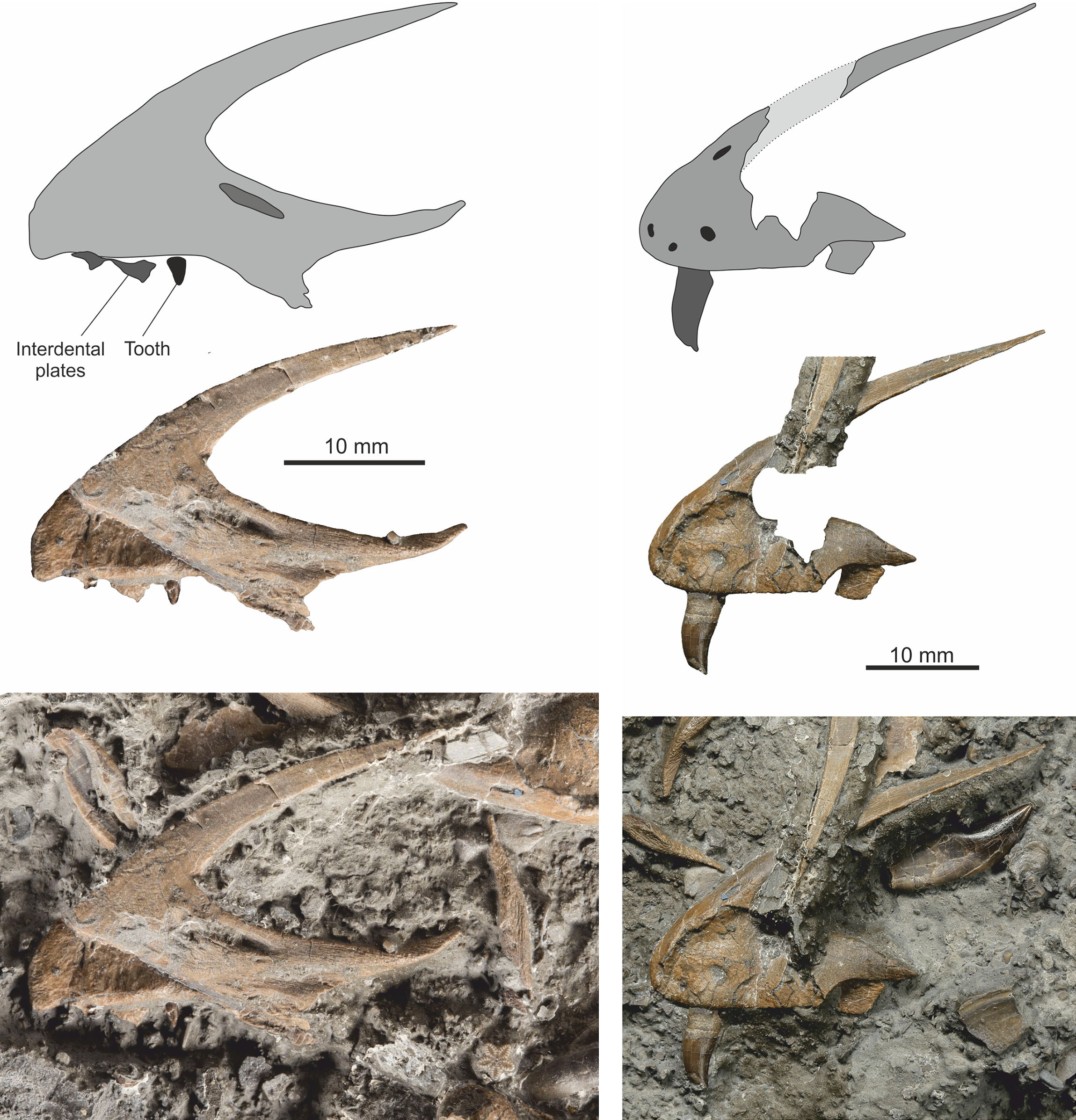 두개골주둥이 앞부분의 각 전상악골은 매우 큰 콧구멍의 앞부분을 감싸고 있다. 두개골에는 각 측면에 3개의 전상악골 이빨과 최소 7개의 상악골 이빨이 있다. 이빨은 뒤로 굽어 있거나 단검 모양이다. 치관의 가장자리에는 밀리미터당 6~8개의 작은 돌기가 있는 톱니 구조가 있다. 이 톱니 구조는 이빨의 뒤쪽 가장자리에서는 뿌리까지 이어지지만, 앞쪽 가장자리에서는 그보다 높은 위치에서 끝난다. 이 톱니는 이빨 끝으로 갈수록 점차 작아진다. 상악골에는 얕은 우묵한 곳(함몰부)이 있는 안와전와와 경계를 이룬다. 협골(관골)은 가늘고 아래쪽 가장자리가 곧으며, 상악골의 뒤쪽 가지와 겹쳐지는 얇은 앞쪽 가지와 누골을 향해 뻗은 위쪽 돌기(얇지만 뾰족하지는 않음)를 가지고 있다. 누골은 직사각형 모양이며 가운데 부분이 좁다.[3][7]