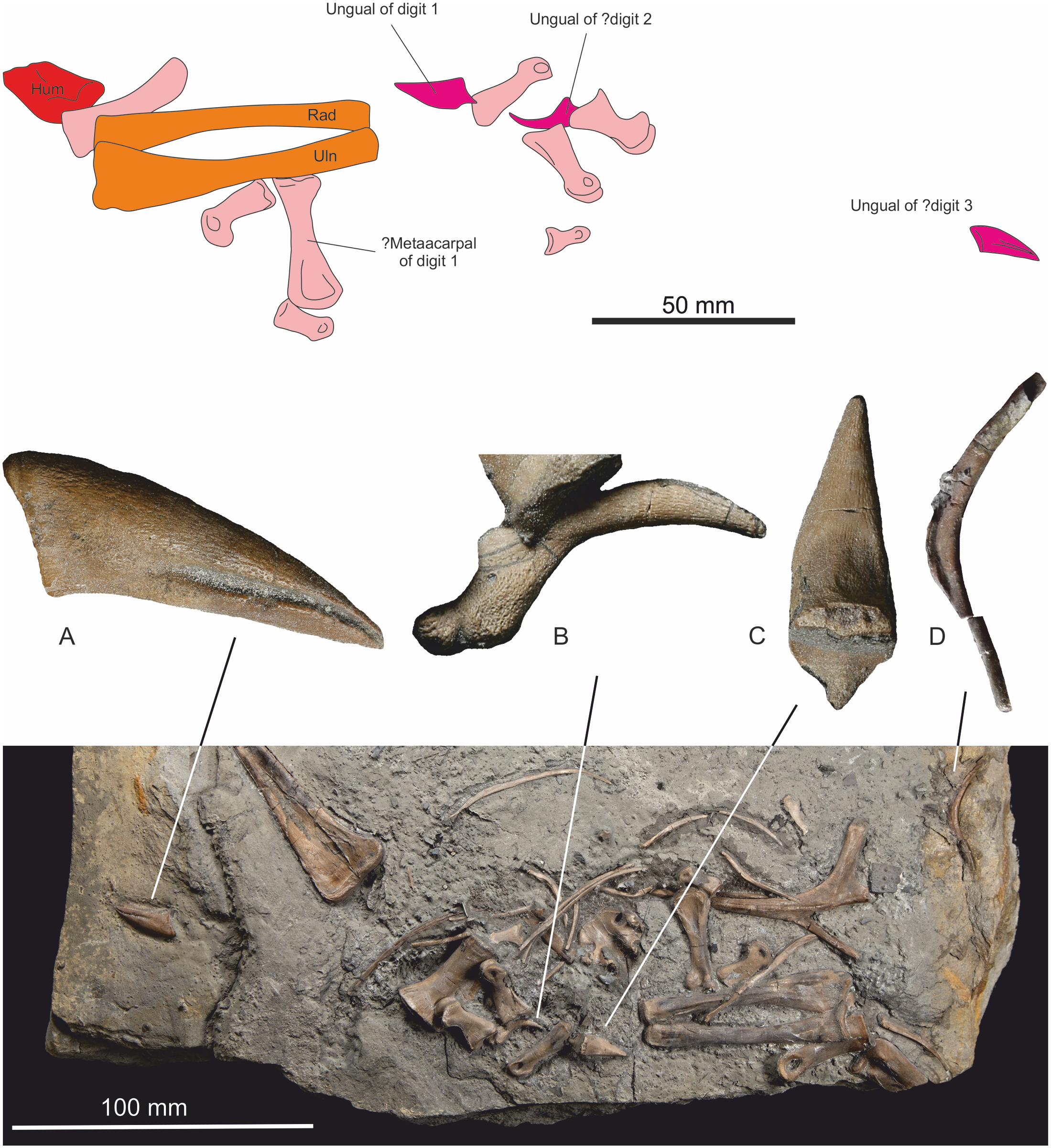 어깨와 앞다리빗장뼈(쇄골 또는 새 발뼈)의 존재가 보고되었다. 빗장뼈는 초기 수각류 화석에서는 드물게 발견되는데, 다른 예로는 ''세기사우루스''(Segisaurus) 와 ''코엘로피시스''(Coelophysis)가 있다. 아래팔 뼈인 자뼈(척골)와 요골의 길이는 약 7cm였다. 손을 구성하는 뼈들도 발견되었지만, 각각 어느 손가락뼈(지골)에 해당하는지는 명확히 알 수 없었다.[3][7]