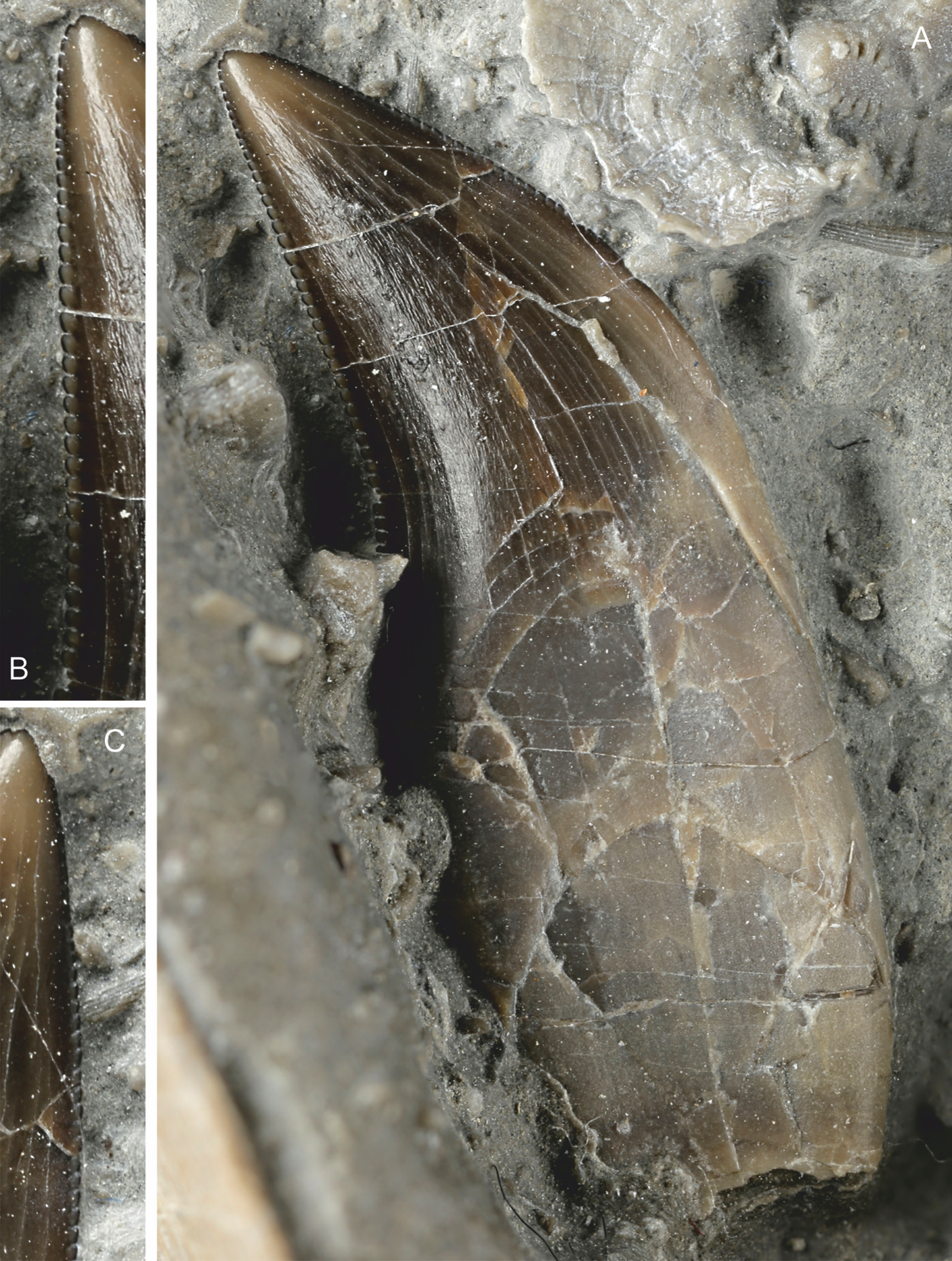 두개골을 살펴보면, 주둥이 끝에서는 좌우의 앞위턱뼈가 매우 큰 콧구멍의 앞쪽을 덮고 있다. 각 앞위턱뼈에는 이빨이 3개, 위턱뼈에는 최소 7개의 이빨이 있다. 이빨은 뒤로 굽어 있거나 단검 모양이며, 가장자리에는 1mm당 6~8개의 작은 돌기가 있는 톱니 구조를 가진다. 이 톱니 구조는 이빨의 뒤쪽 가장자리에서는 뿌리까지 이어지지만, 앞쪽 가장자리에서는 그보다 높은 위치에서 끝난다. 이빨 끝으로 갈수록 톱니는 점차 작아진다. 위턱뼈에는 얕은 함몰부가 있어 눈앞구멍(antorbital fenestra)과 구분된다. 관골은 아래쪽 가장자리가 곧은 얇은 뼈이며, 눈물뼈(lacrimal bone) 방향으로 뻗어 있지만 돌출되지 않은 뒤쪽 가지를 앞쪽 가지가 덮고 있다. 눈물뼈는 대체로 직사각형 모양이며 중앙 부분이 가늘다.[7]