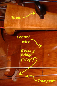 프랑스식 악기에서는 tirant|티랑fra이라고 불리는 페그를 돌려 버징 브릿지의 민감도를 조절할 수 있다. 티랑은 악기의 테일피스에 위치하며, 와이어나 실을 통해 trompette|트롬페트fra 현과 연결되어 있다. 티랑을 조절하면 트롬페트 현에 가해지는 측면 압력이 변하여, 바퀴 속도 변화에 대한 버징 브릿지의 반응 민감도를 설정할 수 있다. 버징 효과를 내기 어려울 때는 브릿지 상태를 sec|세크fra('건조한') 또는 chien sec|시엔 세크fra라고 하며, 쉽게 효과를 낼 수 있을 때는 gras|그라fra('기름진') 또는 chien gras|시엔 그라fra라고 표현한다.