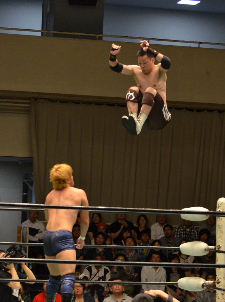 일본에서는 국제 프로레슬링에 내일한 에드워드 카펜티어가 처음 선보였고[17], 1975년에 전일본 프로레슬링에 내일한 리키 깁슨(록앤롤 익스프레스의 로버트 깁슨의 친형)이 선보여 화제가 되었다.[17] 다이너마이트 키드와 조니 스미스는 착지한 후 헤드 스프링 요령으로 훌쩍 일어나는 스타일을 취했다.