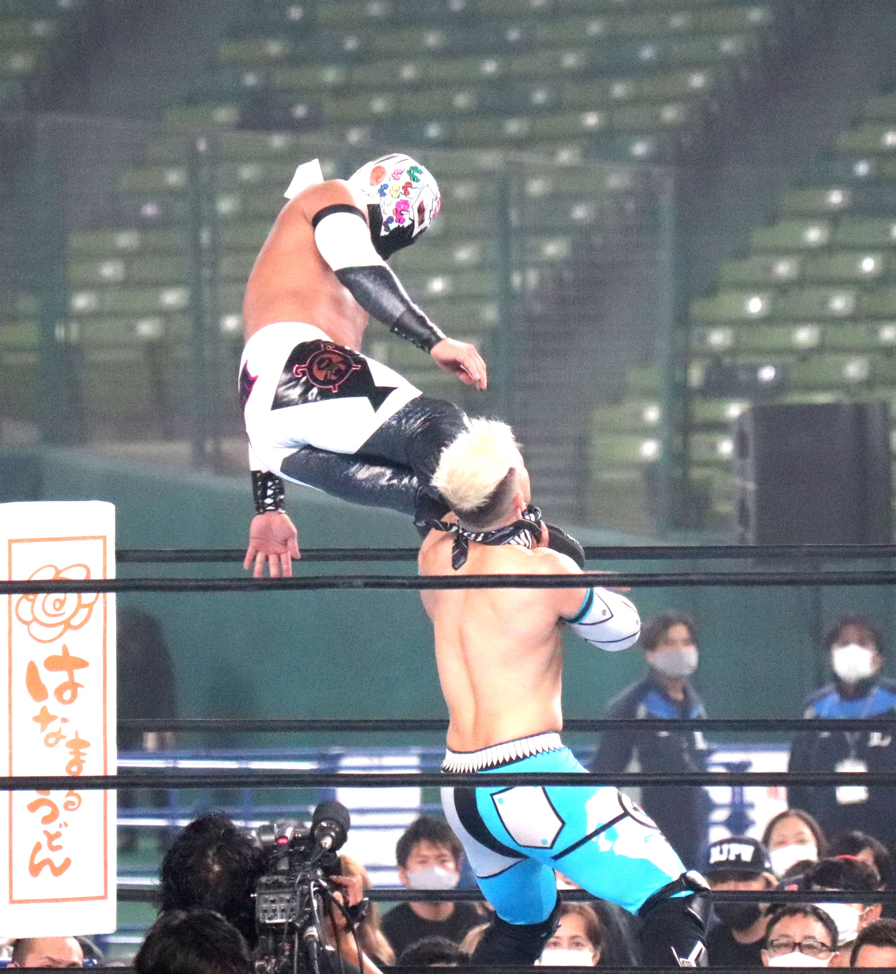 : 상대에게 킥을 맞힌 후, 뒤로 1회전하여 앞으로 낙법을 친다. 점프력과 민첩함을 어필하기에 좋은 기술. '''선회식'''이라고도 불리며 더그 퍼너스가 백덤블링하는 것과 같은 '''세로 회전식'''을, 미사와 미츠하루가 '''가로 회전식'''을 주특기로 사용했다.[15]
