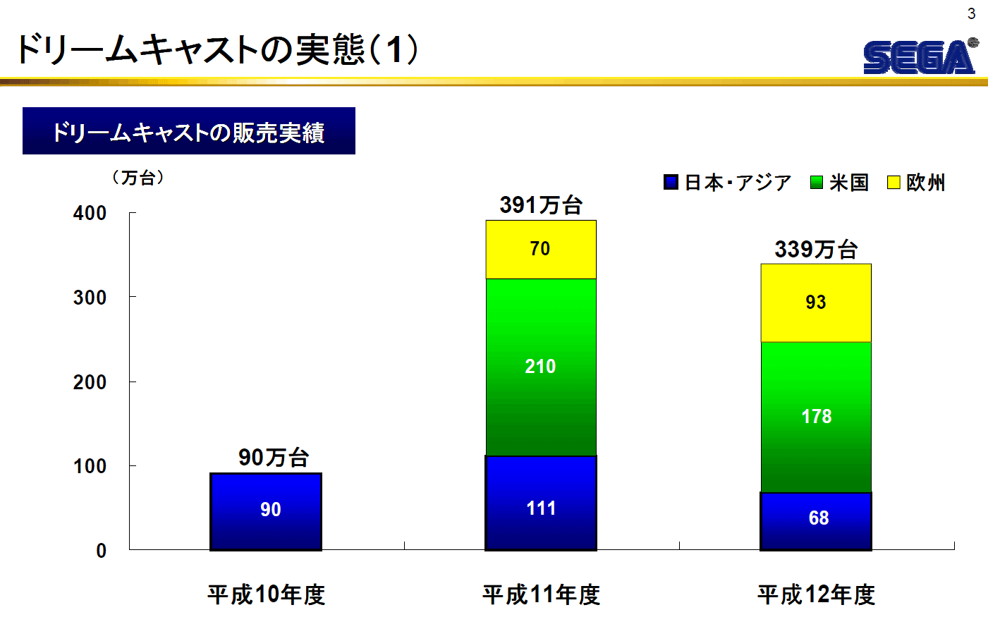 이로 인해 본체 200만 대의 재고 정리 손실과 해외 판매 자회사의 청산 등으로 세가는 2001년 3월 결산에서 약 811억 엔의 특별 손실을 기록했다. 이전에도 드림캐스트 출시와 판매 부진으로 1998년 3월부터 2000년 3월까지 3년 연속 350억~430억 엔의 연결 순손실을 기록했다.