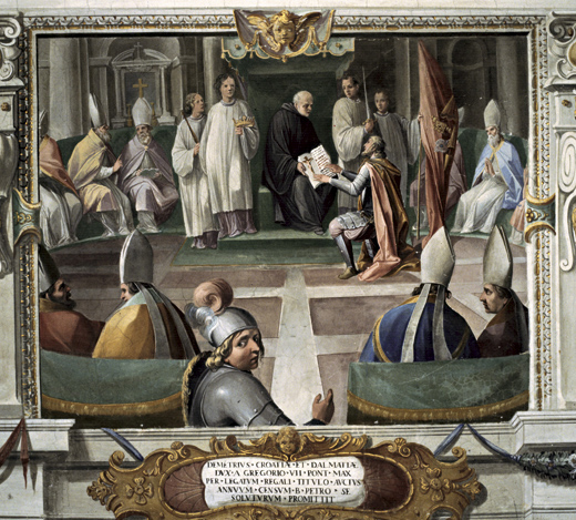 즈보니미르는 교황에게 "베드로의 헌금"을 약속하고 충성을 맹세하며 크로아티아에서 교회 개혁을 지원할 것을 약속했다.[17][20] 그는 교회와 수도사, 가난한 자와 고아를 보호하고, 사촌 간의 불법적인 결혼을 기소하며, 반지와 사제의 축복으로 합법적인 결혼을 성립시키고, 그러한 결혼을 타락으로부터 보호하며, 인간 거래에 반대할 것을 약속했다.[17][21] 또한 베네딕토회의 자다르 주 브라나에 있는 성 그레고리 수도원에 두 개의 금관(보석이 박혀 있으며, 이전 비잔틴 제국으로부터 받은 크로아티아 왕관일 가능성이 높다[22])을 교황청에 헌납했는데, 이는 충성의 표시이자 크로아티아를 방문하는 교황 사절을 위한 숙소로 사용되었다.[17][23] 이로써 즈보니미르의 크로아티아는 교황청의 봉신이 되었다.