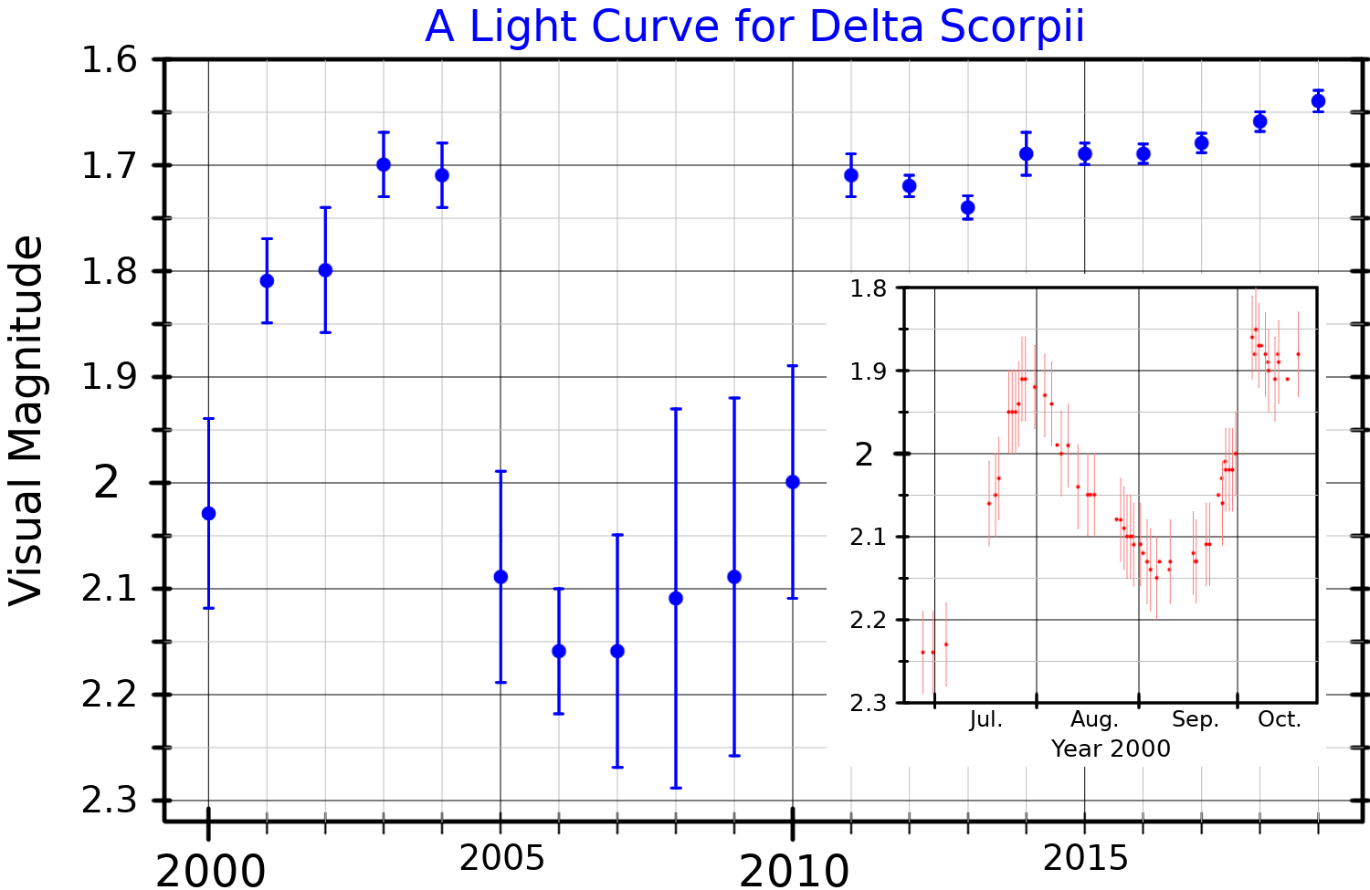 2000년 6월, 세바스티안 오테로(Sebastian Otero)는 델타 전갈자리의 밝기가 평상시보다 0.1 등급 밝아진 것을 발견했다. 이후 델타 전갈자리의 밝기는 계속 증가하여 1.6 ~ 1.7 등급까지 밝아졌으며, 이로 인해 전갈자리의 모습이 달라 보일 정도였다.