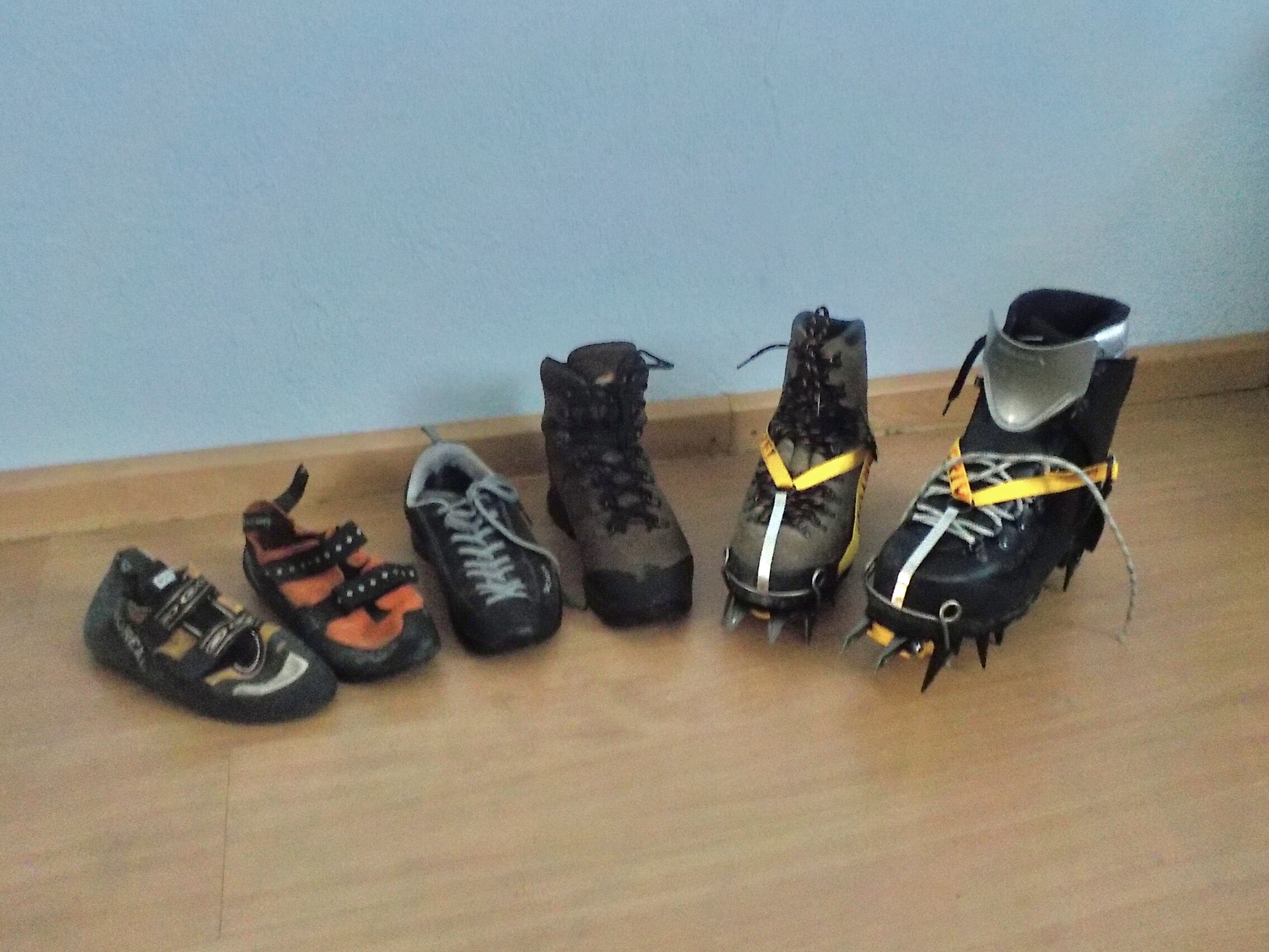 - '''클라이밍 슈즈''': 자유 등반, 암벽 등반용으로, 발에 딱 맞고 마찰이 강하다.
