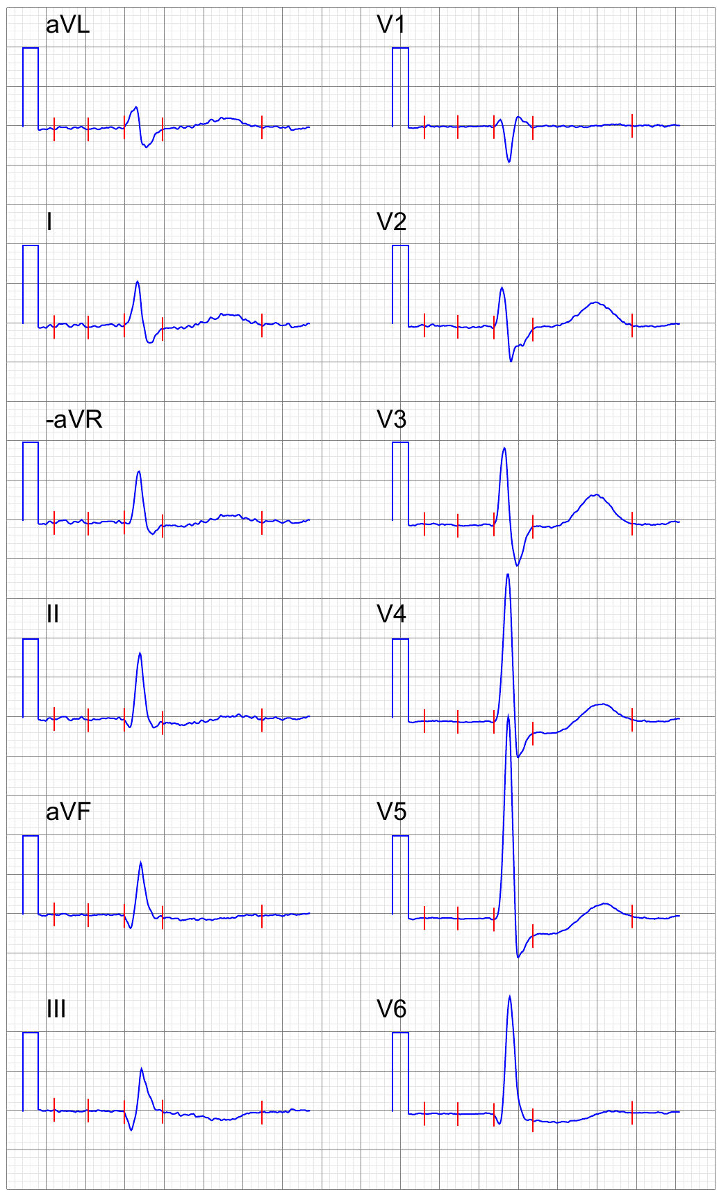ECG 상에서는 방실 결절 전도 지연으로 인해 PR 간격이 길어지고, 활동 전위 단축으로 QT 간격이 짧아지는 변화가 나타날 수 있다. 또한 T파가 평탄해지거나 역전되고, ST 분절이 하강하는 모습(특히 V4, V5 리드)이 관찰되기도 한다. 과도한 자동성 증가는 이소성 박동, 심실 빈맥, 심실 세동과 같은 심각한 부정맥을 유발할 위험이 있다.