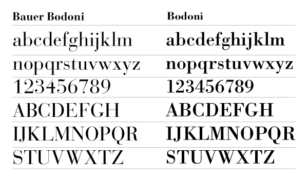 20세기에 들어 디지털 폰트로도 만들어졌는데, 가장 원형의 형태와 정신을 잘 재현한 폰트로는 1924년 독일의 바우어(Bauer)사에서 만든 바우어 보도니(Bauer Bodoni)체가 꼽힌다. 이 서체는 획의 대비와 우아한 글자의 디테일을 잘 살렸다는 평가를 받는다.