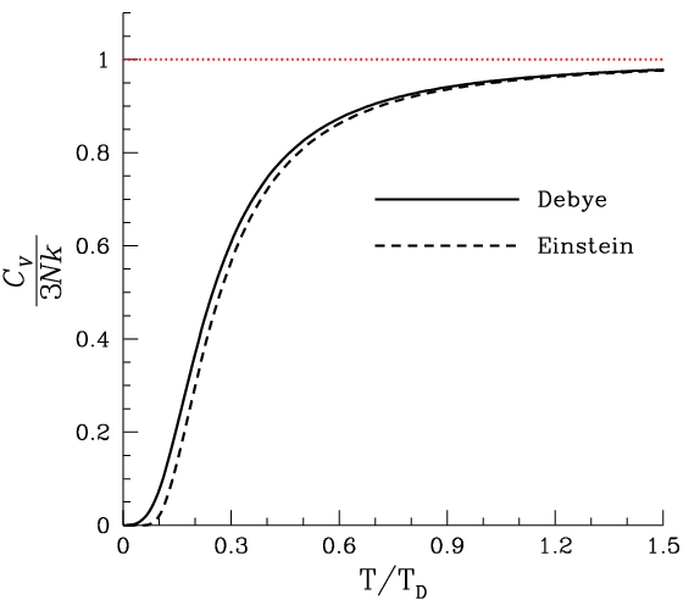 디바이 모형과 아인슈타인 모형이 예측하는 열용량. 실선은 디바이 모형, 점선은 아인슈타인 모형이다. 높은 온도에서는 두 모형 모두 뒬롱-프티 법칙(붉은 점선)에 부합한다.