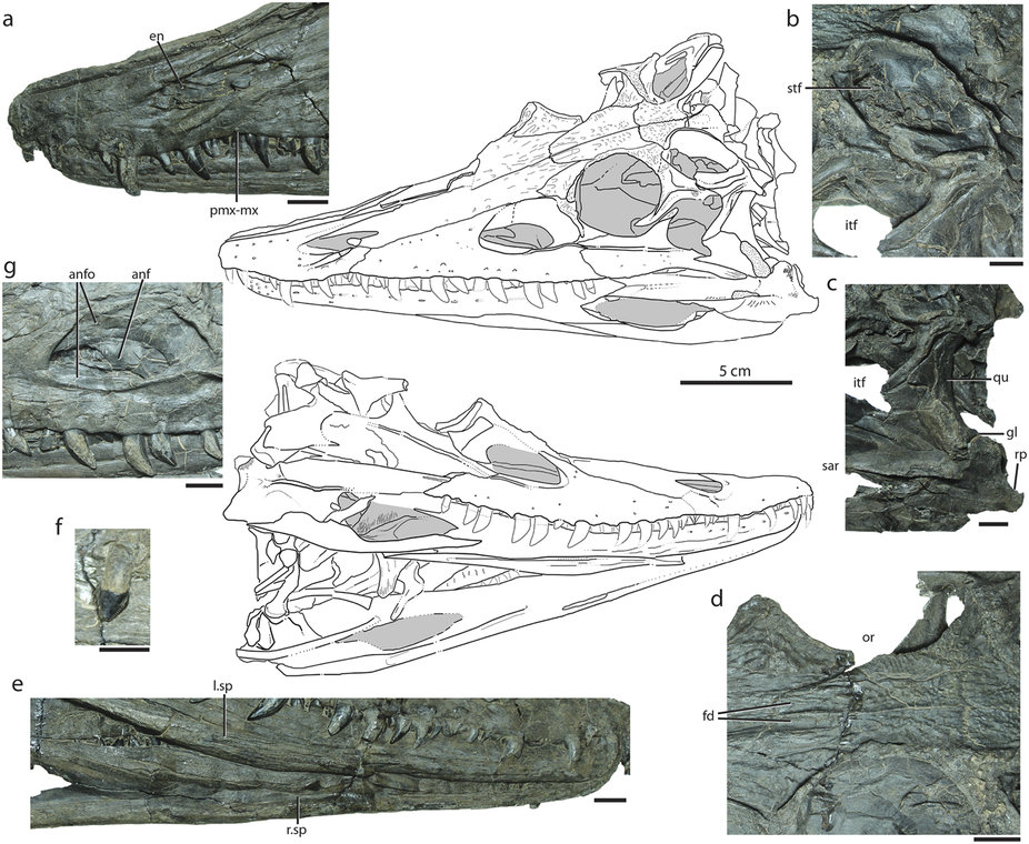 파라수쿠스는 부푼 코와 날카로운 이빨을 가진 멸종된 파충류로, 인도와 아시아 지역에서 화석이 발견되었으며, 잡식성 악어로 추정된다. - 트라이아스기의 동물 - 돌레로사우루스