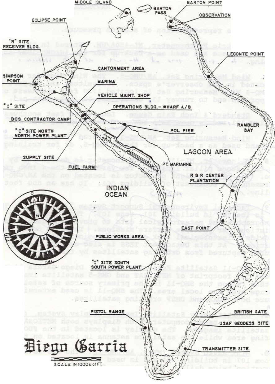1971년 3월, 미국 해군 건설 대대가 디에고 가르시아에 도착하여 통신 기지와 비행장 건설을 시작했다.[30] 같은 해 10월, 영국과 미국의 합의에 따라 디에고 가르시아의 농장이 폐쇄되었고,[31] 농장 노동자들과 그 가족들은 페로스 바뇨스 및 살로몬 환초의 농장으로 이주했다.[32] 1973년에는 해군 통신 기지 건설이 완료되었다.[33]