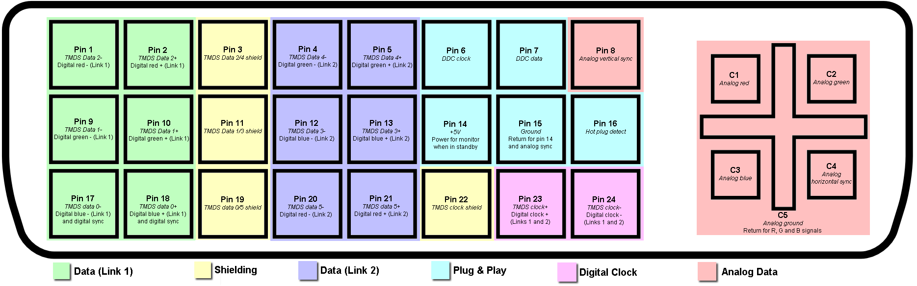 DVI 커넥터는 일반적으로 DVI 전용 디지털 영상 신호를 보내는 핀을 포함하며, 이중 링크 시스템의 경우에는 두 번째 데이터 신호 군을 위한 추가적인 핀들이 제공된다.